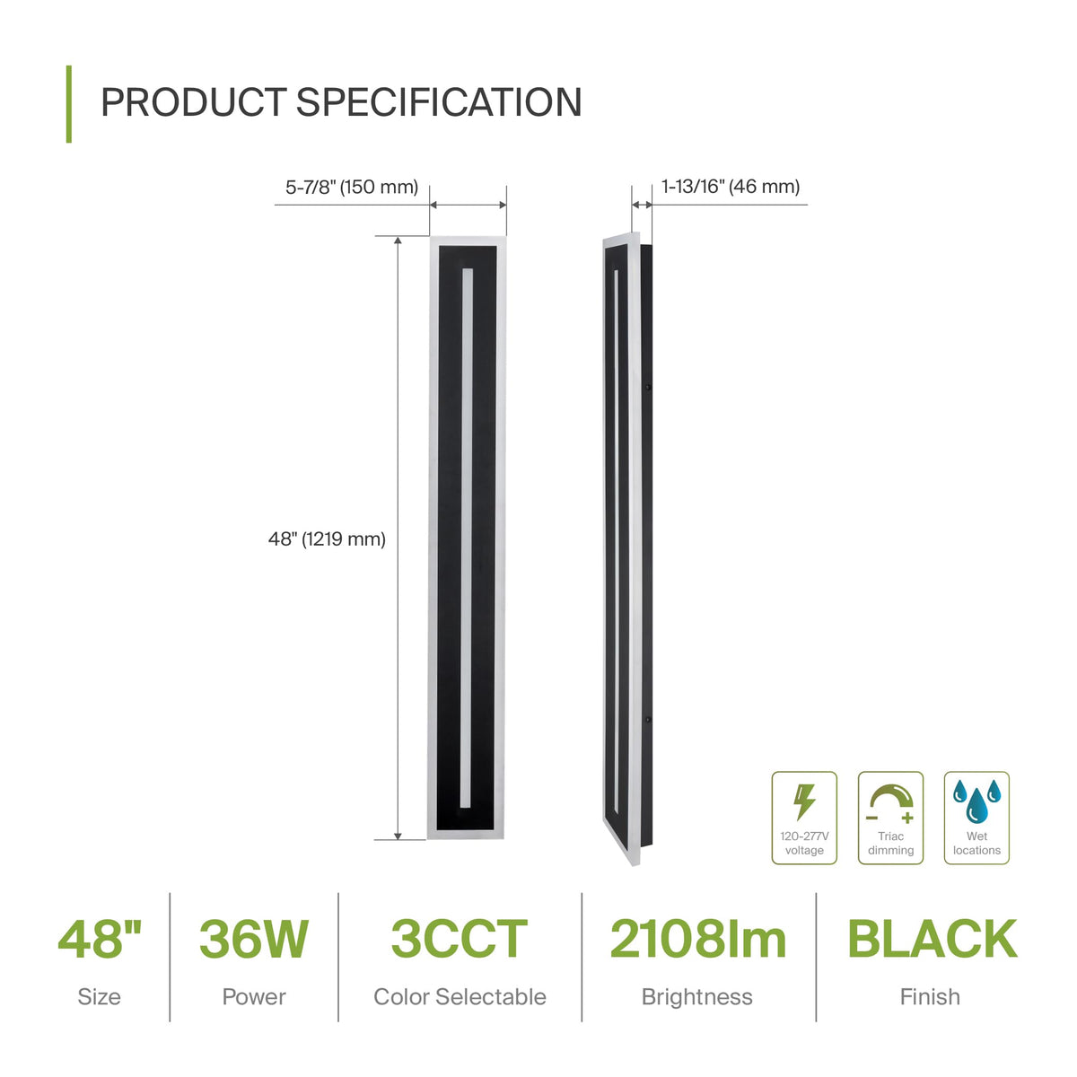 Asd 48" Led Flush Mount Wall Light Fixture, Dimmable, 36W, 2100Lm, Waterproof, Black