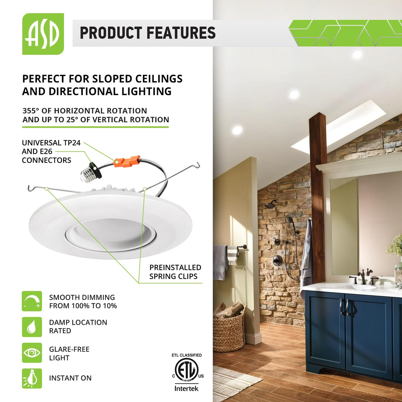 Asd 6 Gimbal Led Recessed Can Retrofit Light 5000K Daylight 15W (110 Watt Replacement) 1100Lm Dimmable Sloped Downlight, Wet Rat
