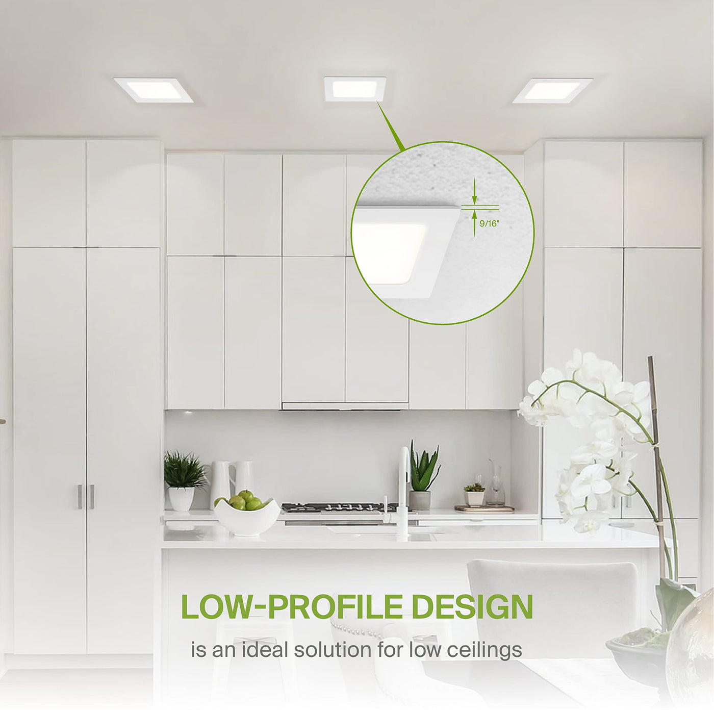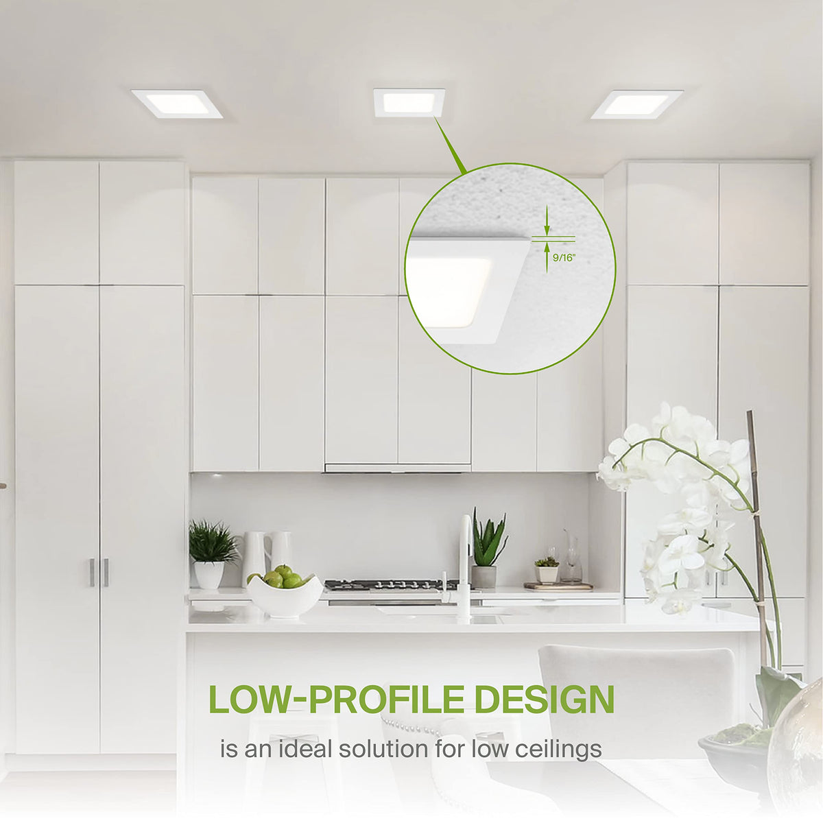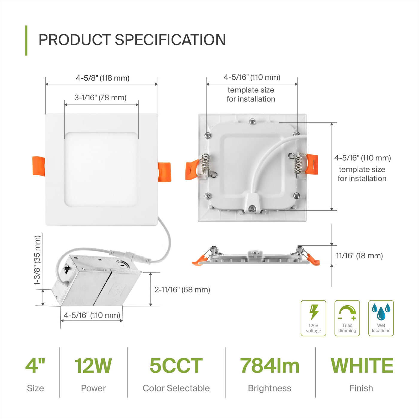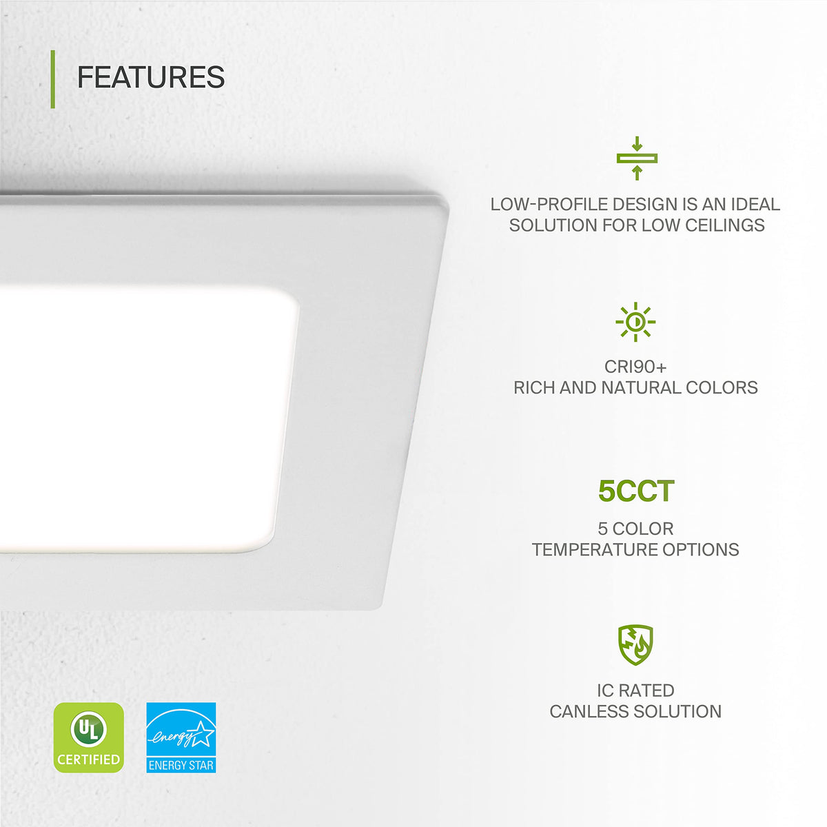 - **Easy Installation**: These IC-rated square LED ceiling lights require no housing or can, making them a breeze to install. Wet Location rated, they are ideal for areas prone to moisture, such as kitchens and bathrooms. Installation template included for convenience.