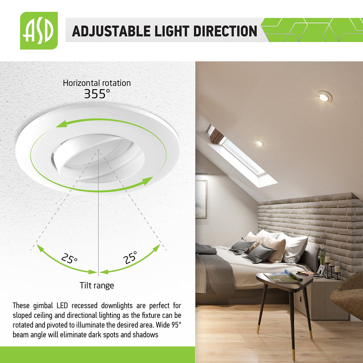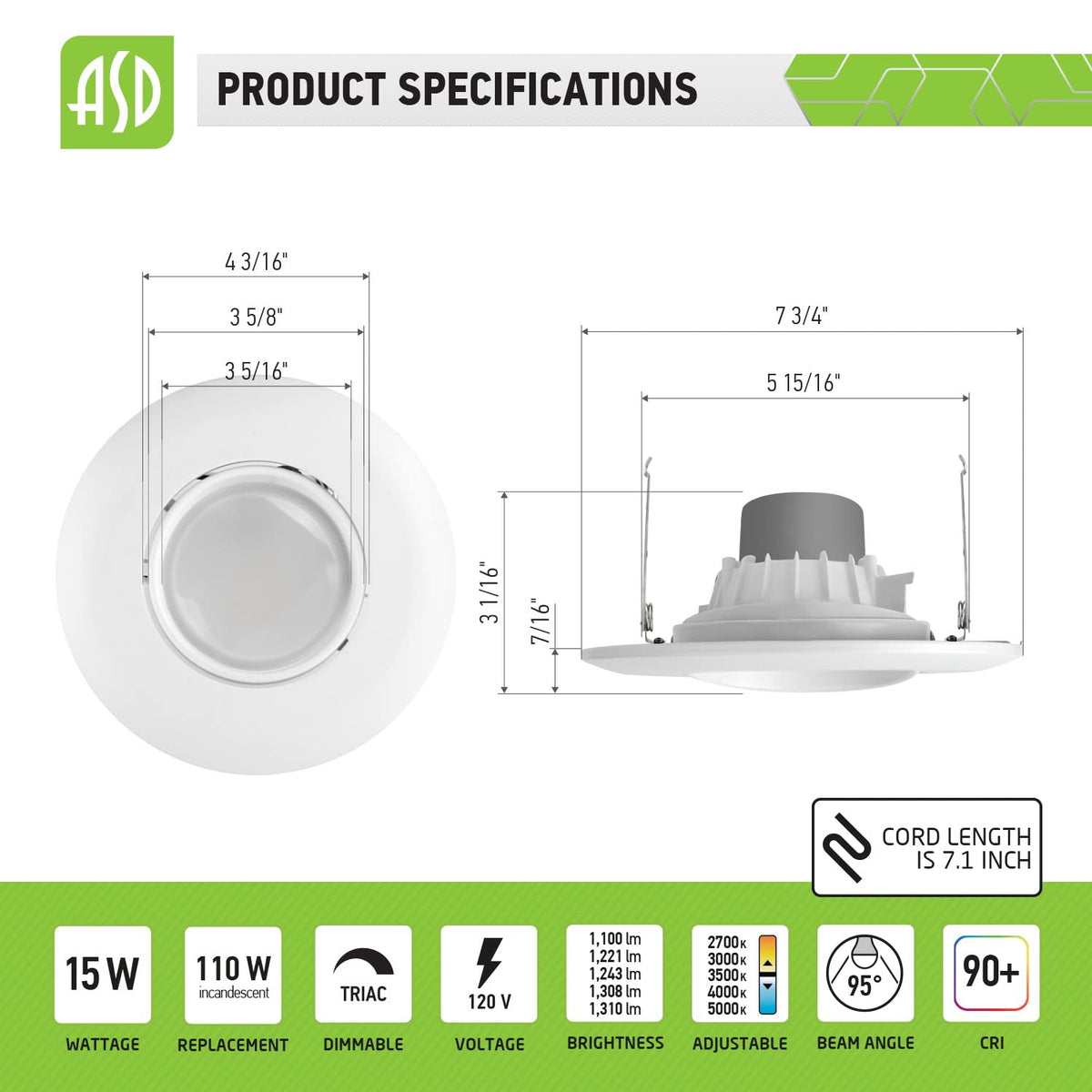 Q: What are the key features of the ASD Gimbal Retrofit LED Can Lights?A: The ASD Gimbal Retrofit LED Can Lights feature adjustable color temperatures ranging from 2700K to 5000K, smooth dimming from 10% to 100%, a 95° beam angle, and a CRI of 90+, ensuring even and high-quality lighting. They are suitable for wet locations and have a lifespan of up to 50,000 hours.