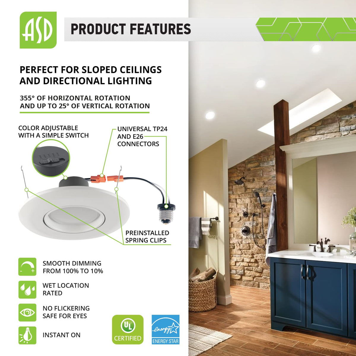 Illuminate your space with the ASD LED Downlight Retrofit Kit Gimbal, designed to enhance both functionality and aesthetics in any room. This versatile lighting solution is perfect for sloped ceilings and directional lighting, offering smooth dimming capabilities and customizable color temperatures to suit your environment.