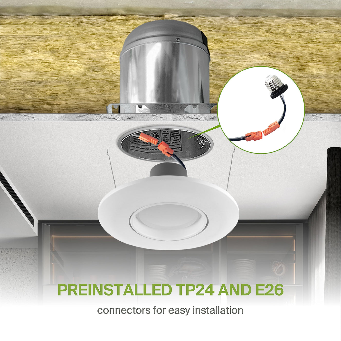 Q: How easy is it to install the ASD Gimbal Retrofit LED Can Lights?A: Installation is straightforward with the included universal TP24 or E26 connectors. The preinstalled spring clips make it easy to mount in most new construction and remodel lighting housings. Detailed installation instructions are provided for assistance.
