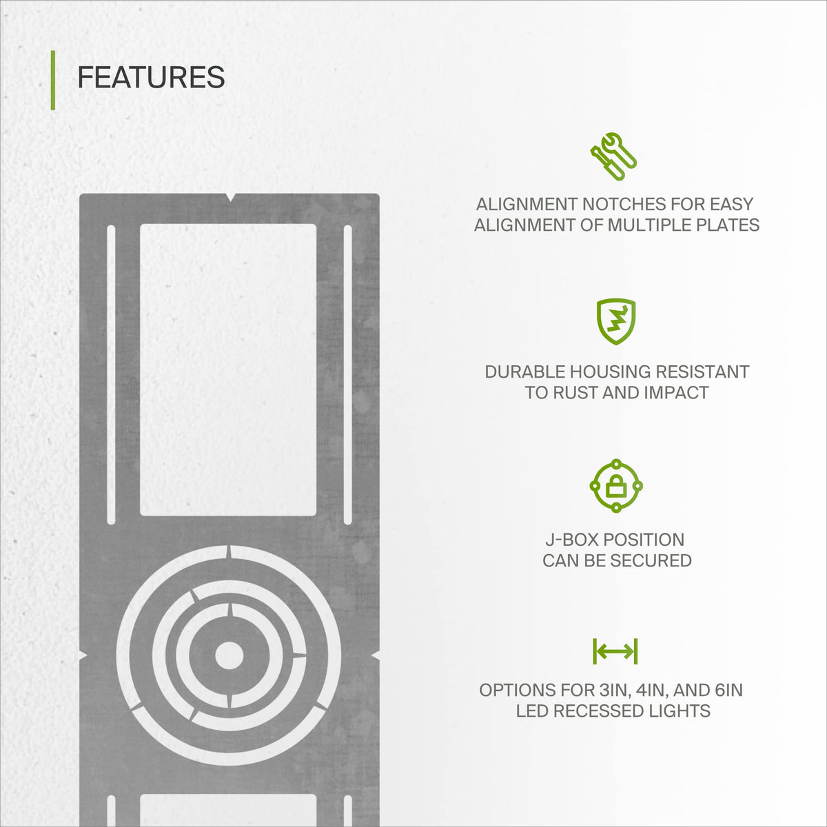 Q: What sizes of LED recessed lights can the ASD Mounting Plate accommodate?A: The ASD 6 Pack New Construction Mounting Plate is designed to accommodate a range of LED recessed lights, specifically 3-inch, 4-inch, and 6-inch sizes, making it a versatile choice for various lighting projects.