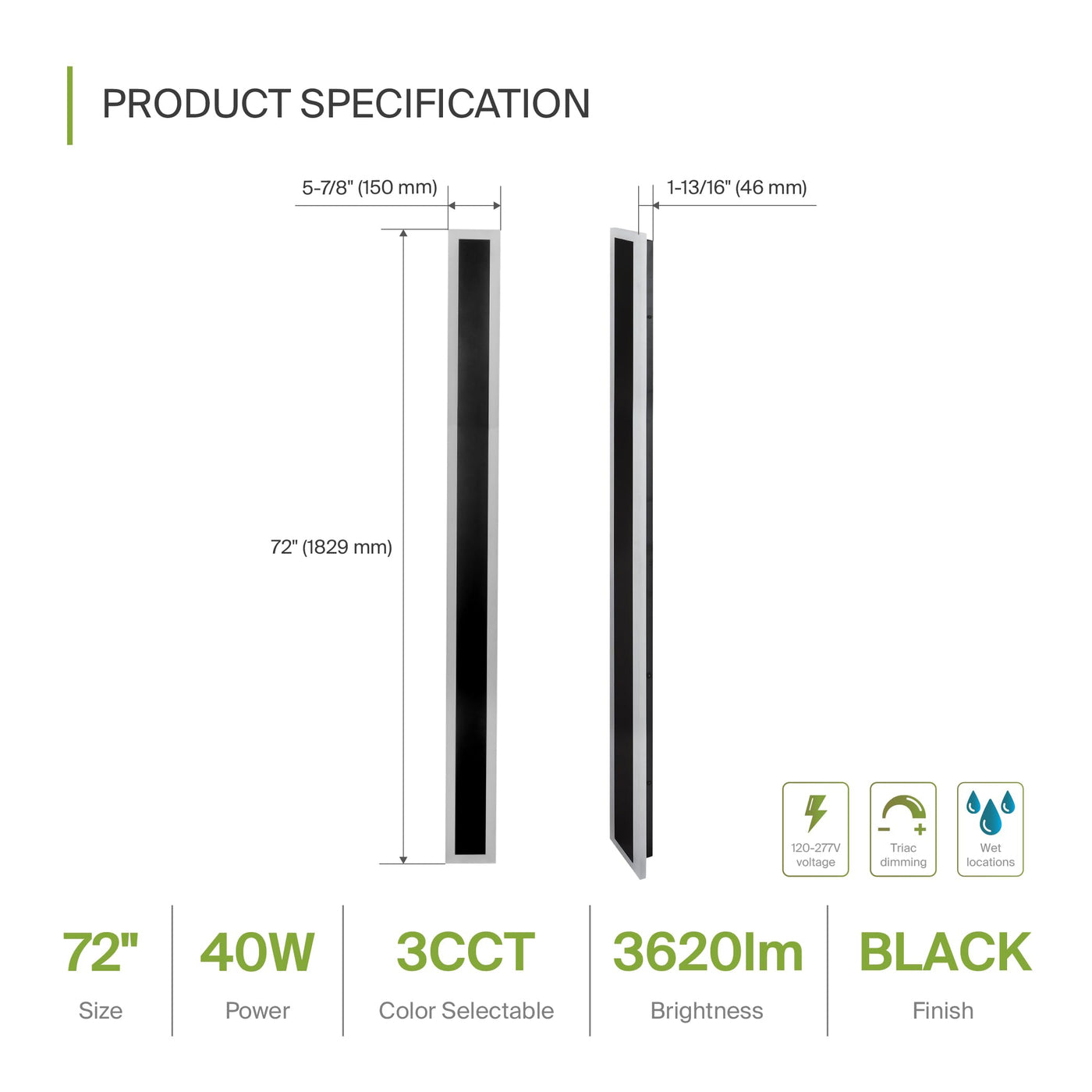 Asd 72" Led Flush Mount Wall Light Fixture, Dimmable, Waterproof, 40W, Black, Etl Listed
