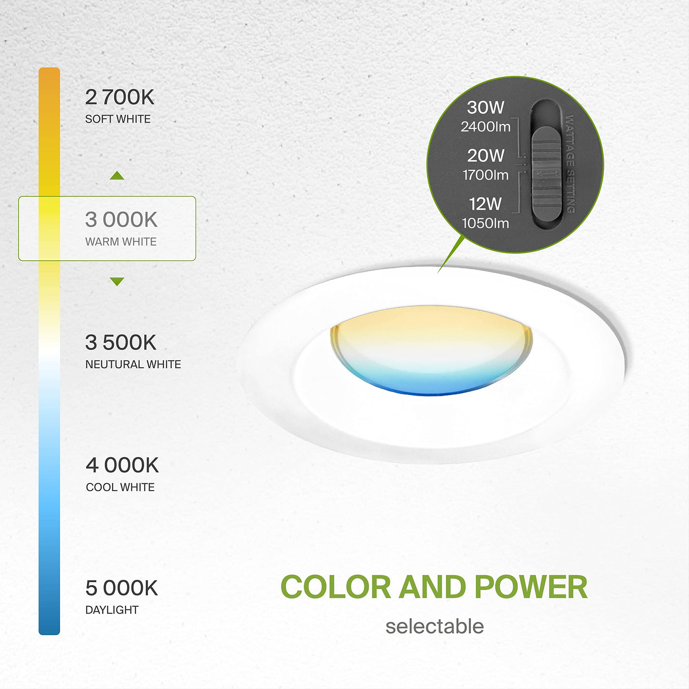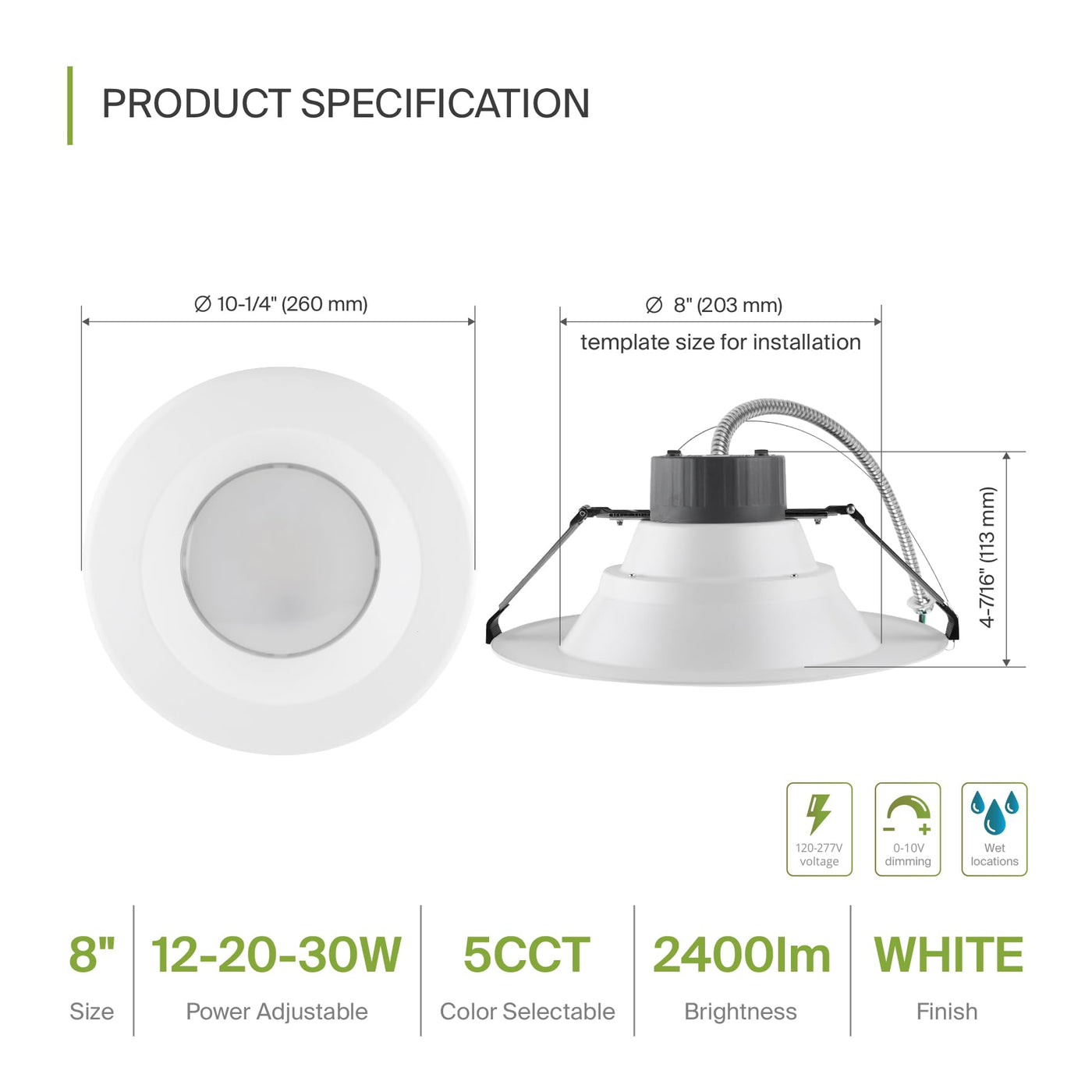Asd 8 Inch Canless Led Downlight, Dimmable 12/20/30W, 5 Color Temps,