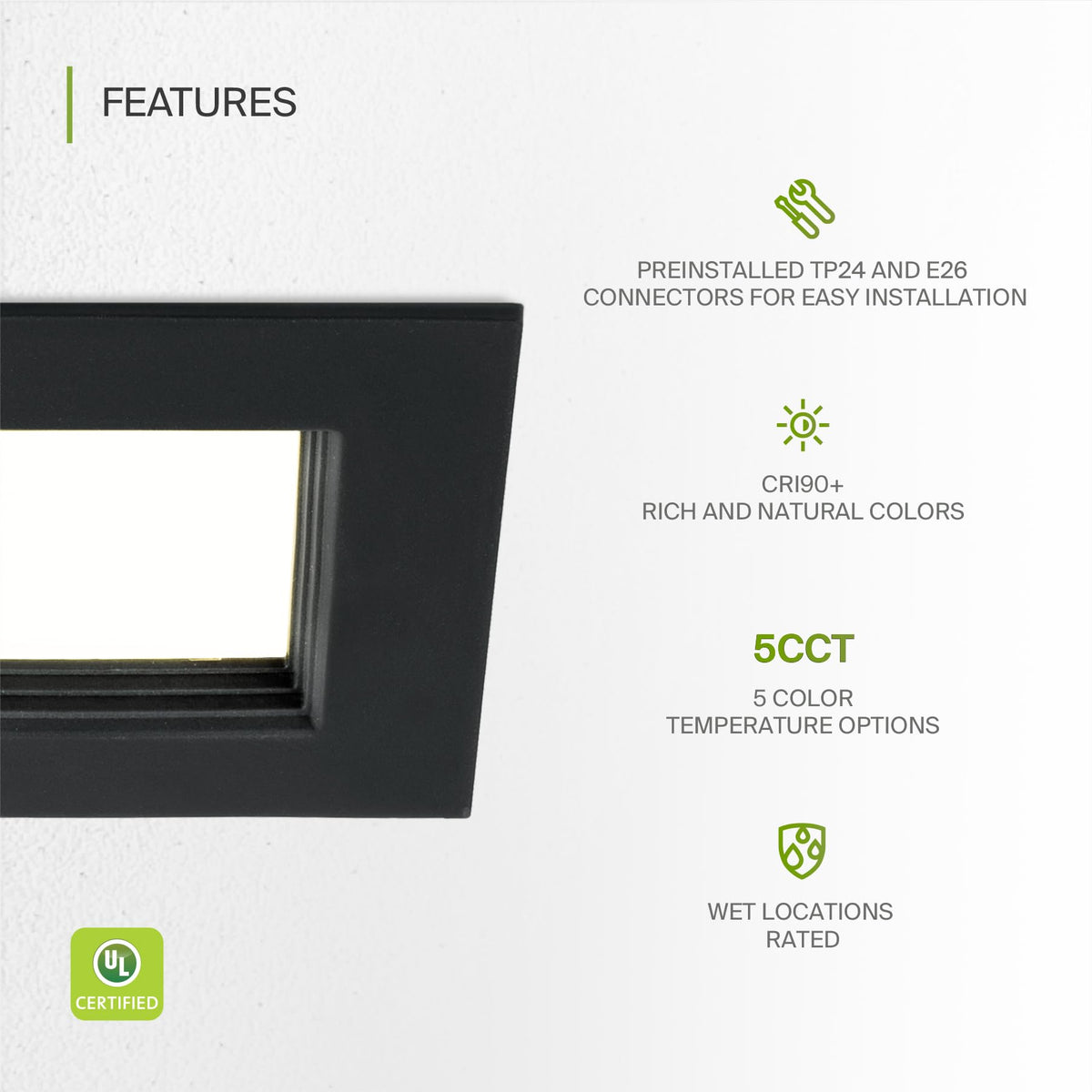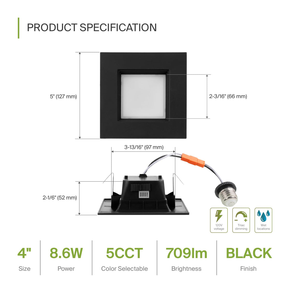 Asd Black 4 Inch Led Recessed Lighting Retrofit Square 5 Cct Selectable 2700K 3000K 3500K 4000K 5000K Adjustable Dimmable 8.6W 7