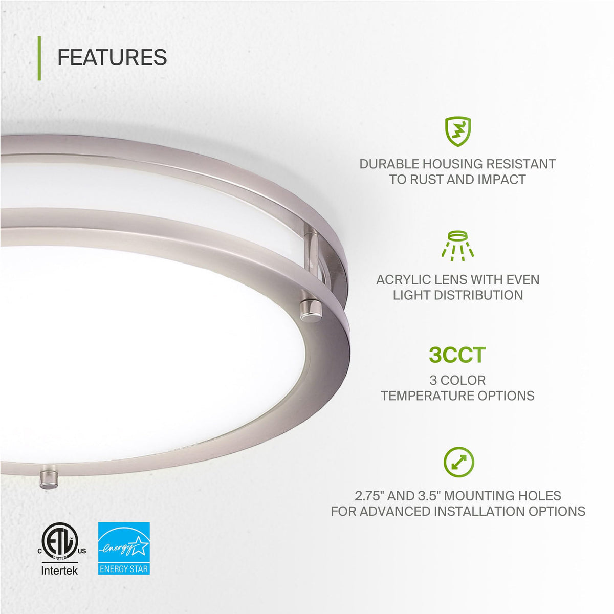 Asd Led 16 Inch Round Flush Mount Light Fixture | 24W 1900Lm 3000K-5000K 120V | 3Cct Dimmable Energy Star Etl Listed | Close To Ceiling Double Ring Lamp Low Profile Lighting | Nickel