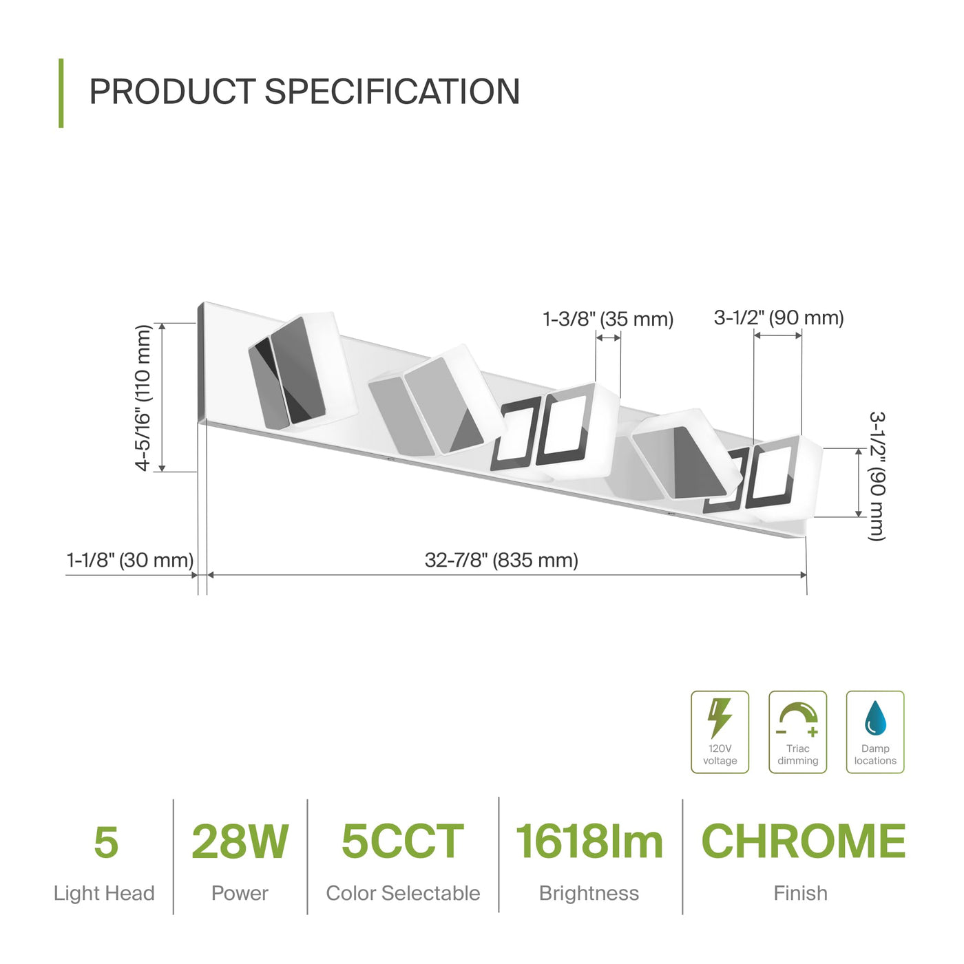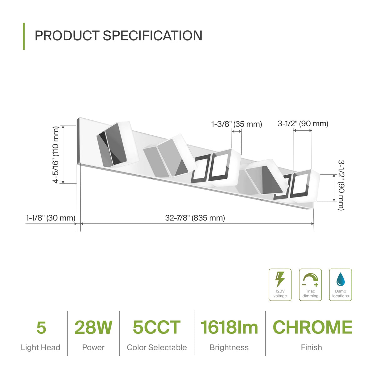 Asd Led 33 Inch Bathroom Vanity Light Fixture | 5-Lights 28W 1600Lm 2700-6000K 120V | 5Cct, Dimmable, Rotatable Heads, Etl Liste