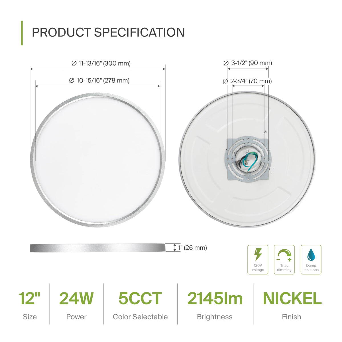 The ASD 12in Round LED Ceiling Light in Nickel is designed to enhance various indoor spaces with efficient and customizable lighting. Ideal for areas such as offices, kitchens, bathrooms, and hallways, this fixture provides bright illumination while maintaining energy efficiency.