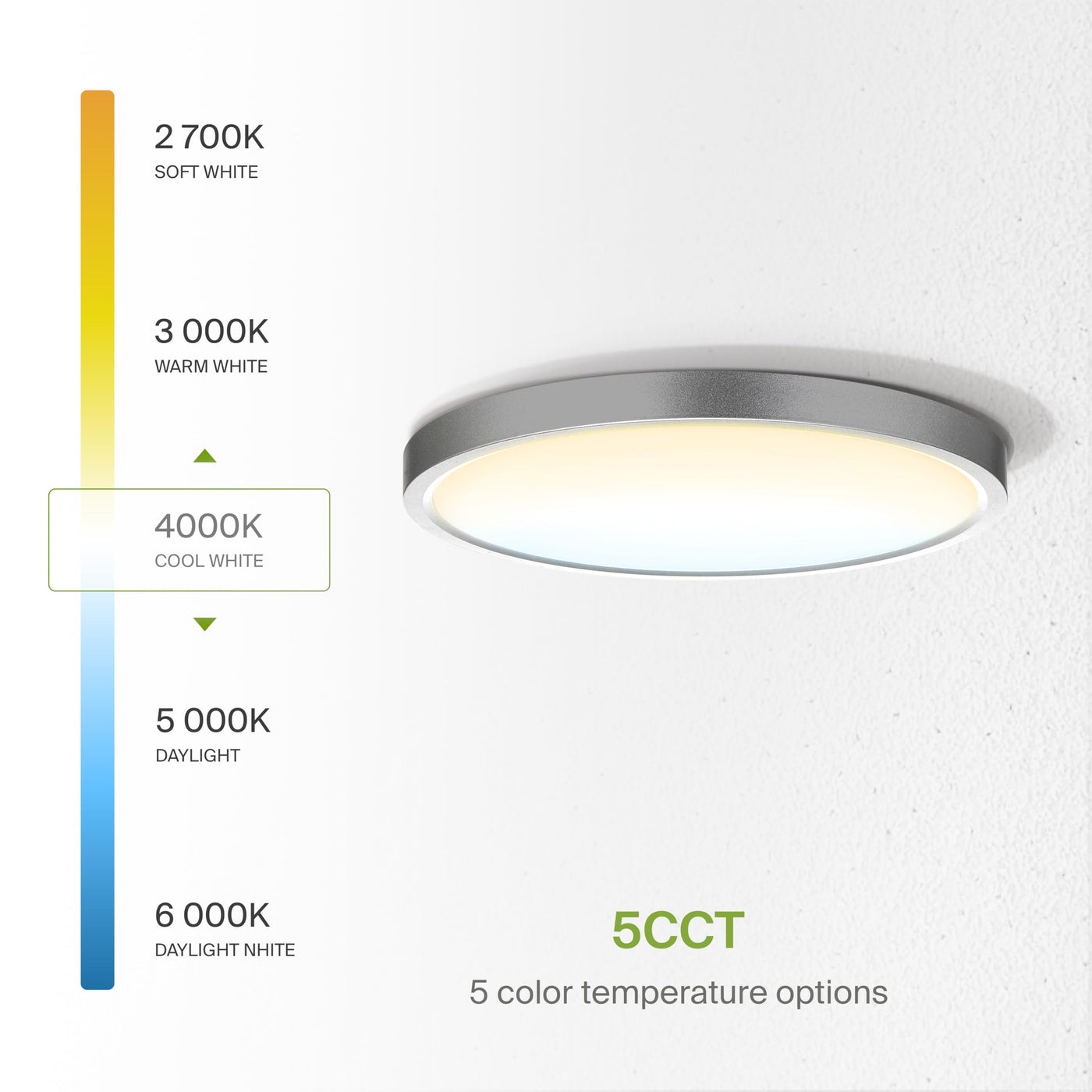 Q: What color temperatures are available for this light fixture?A: The ASD LED ceiling light offers five selectable color temperatures, ranging from twenty-seven hundred Kelvin (warm) to six thousand Kelvin (cool), allowing you to customize your lighting ambiance.