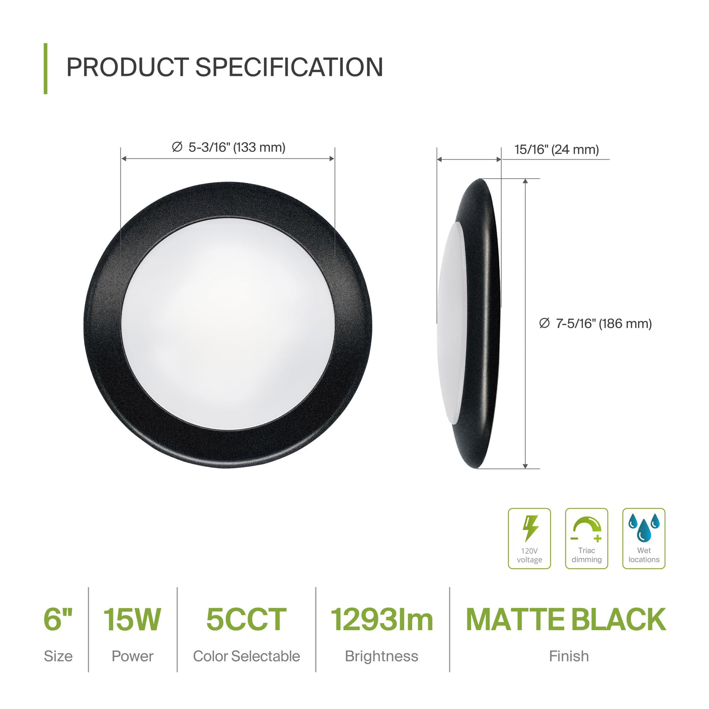 ASD LED Disk Lights 6 Inch 15W 5CCT Dimmable Matte Black Metal Housing Model A-LDS-6D15MB-6p