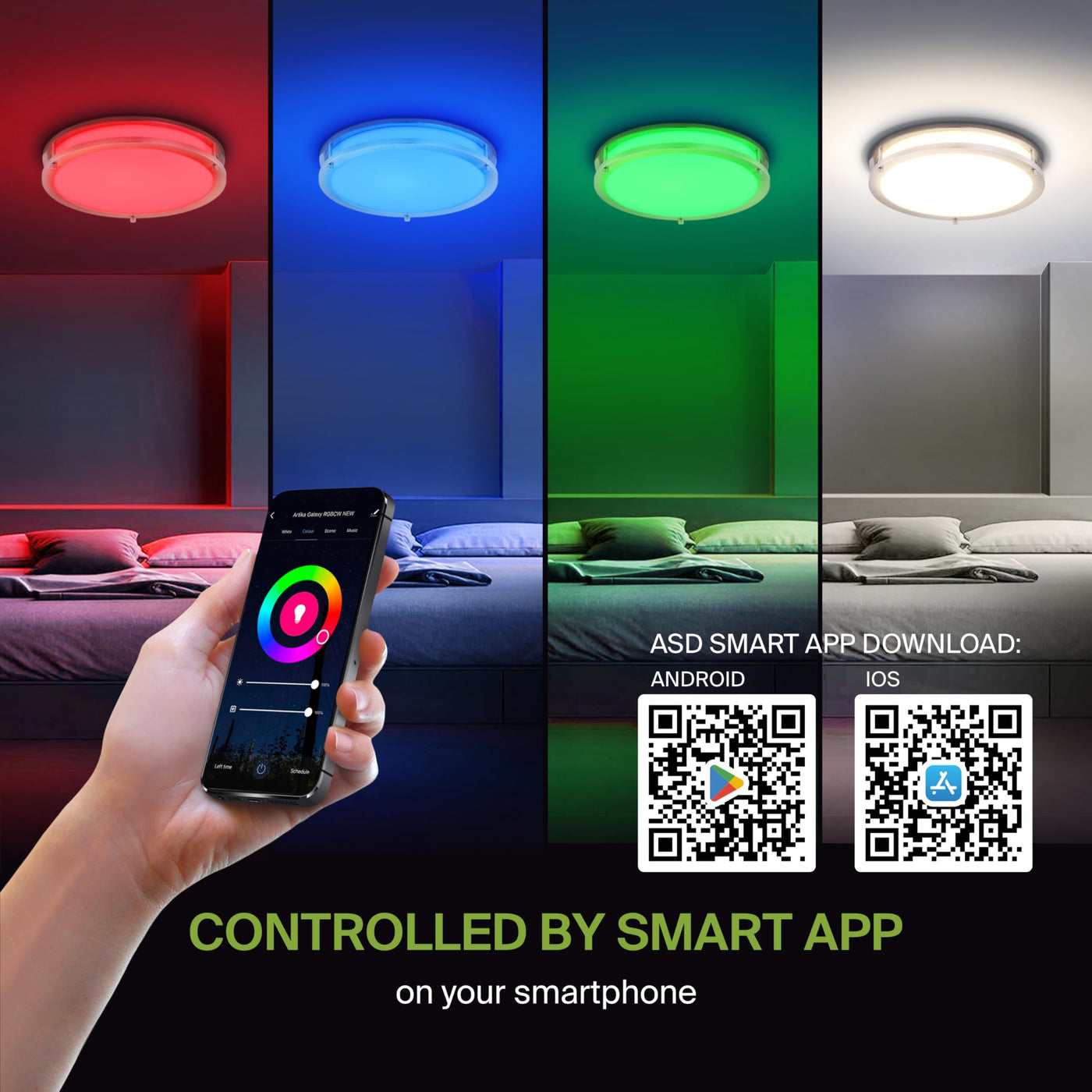 Q: Is this light fixture compatible with smart home systems?A: Yes, the ASD LED Flush Mount Light Fixture can be managed via a smartphone app or voice assistants such as Alexa, Google Assistant, and Siri, enabling both separate and group control.