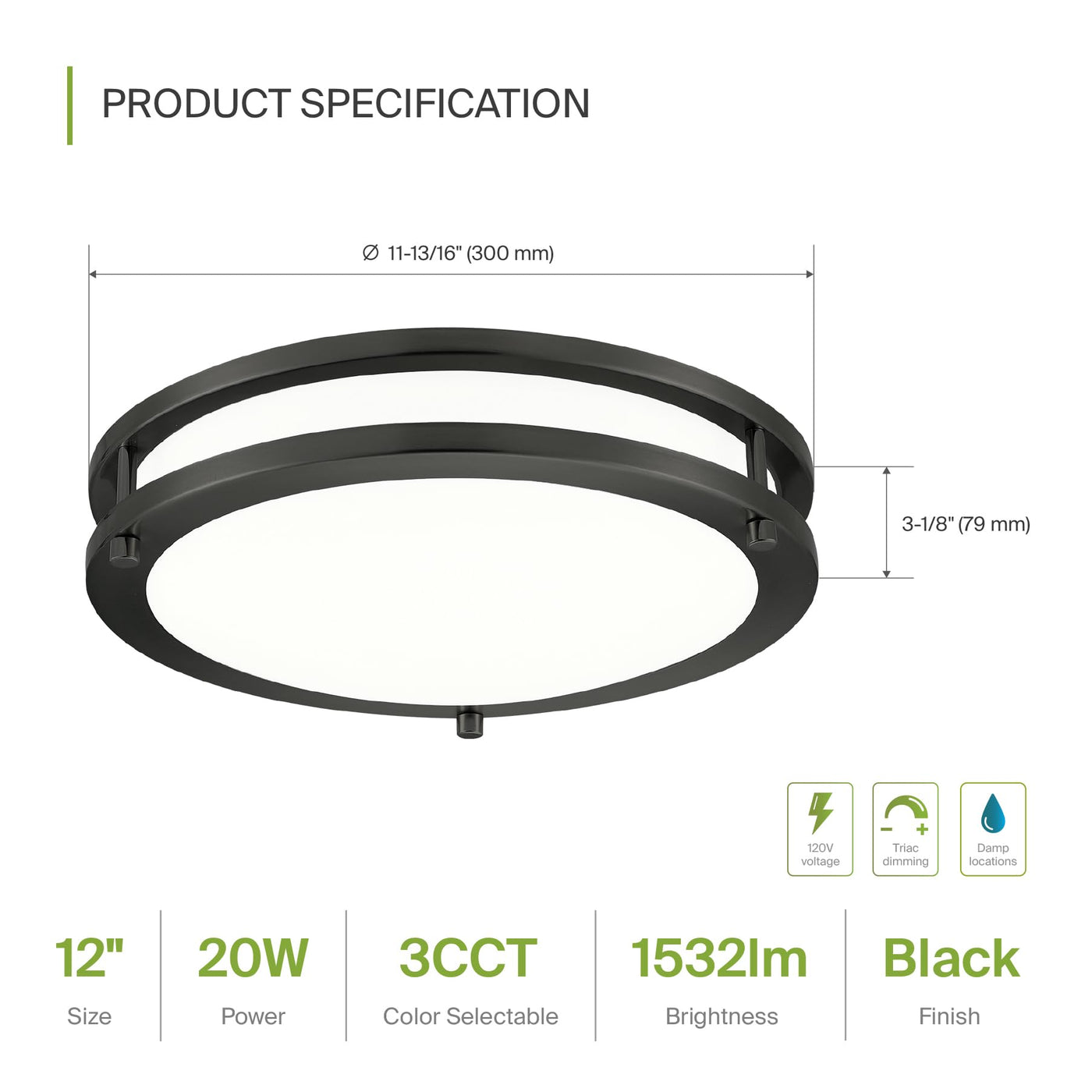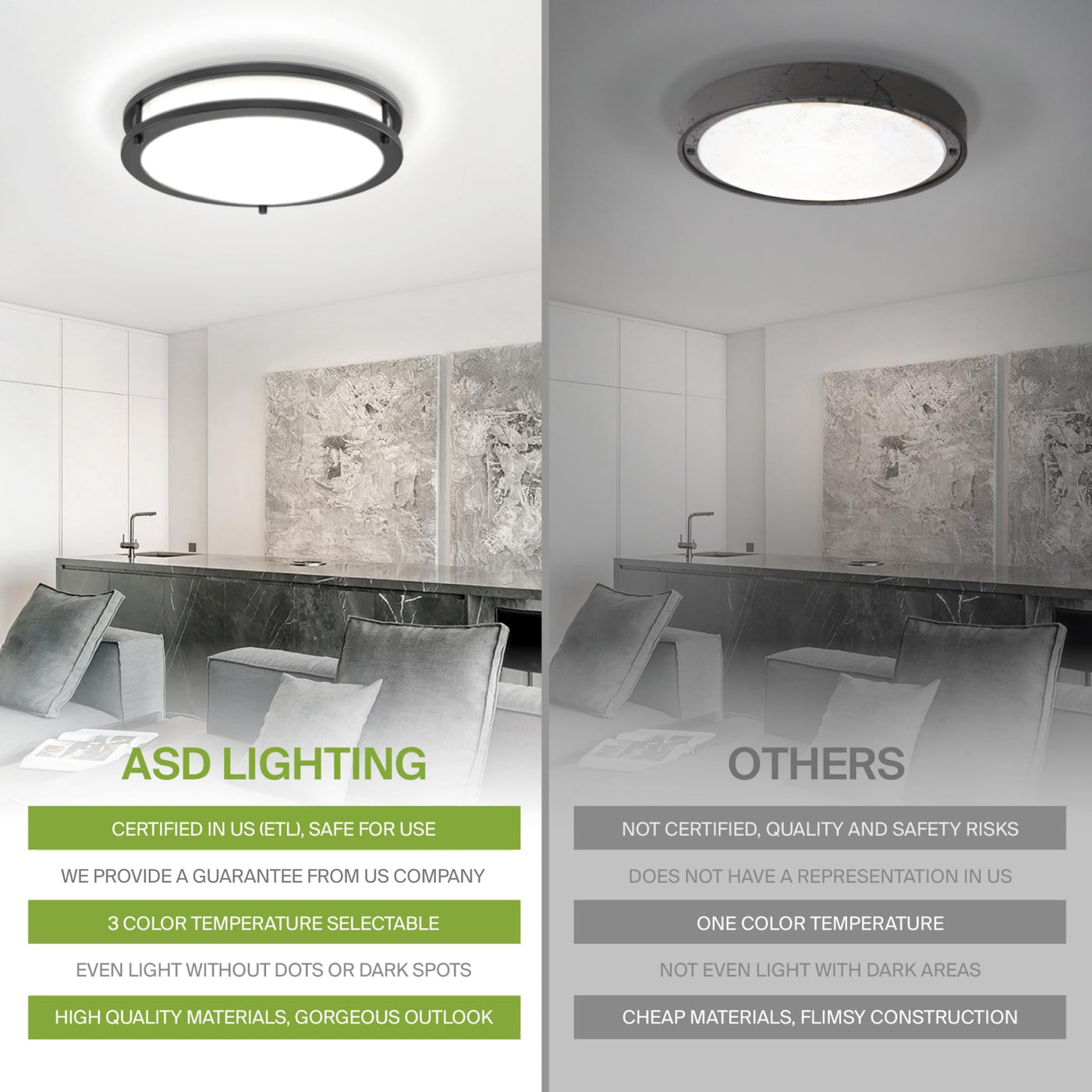 ASD LED Flush Mount Light Fixture, 20W 1550LM, Dimmable, 12 Inch, Black, Model A-LFMDR-12D20CCBK