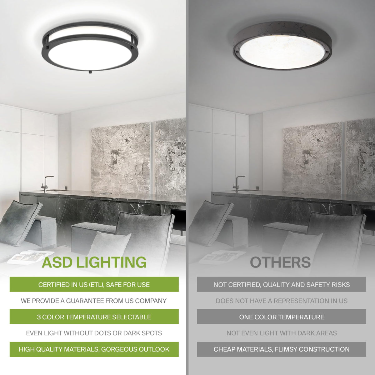 The ASD 14 Inch Black LED Ceiling Light Fixture is an ideal lighting solution for various spaces including kitchens, bathrooms, living rooms, and more. Its sleek design and powerful LED technology make it a versatile addition to any home or commercial setting.