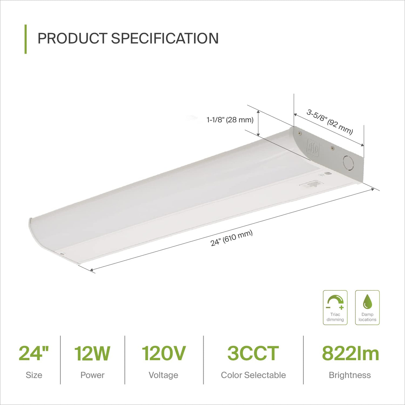 ASD LED Under Cabinet Lighting, 24 inch 12W 822 LM, Dimmable Hardwired Under Cabinet Lights for Kitchen, 3000K/4000K/5000K, Unde