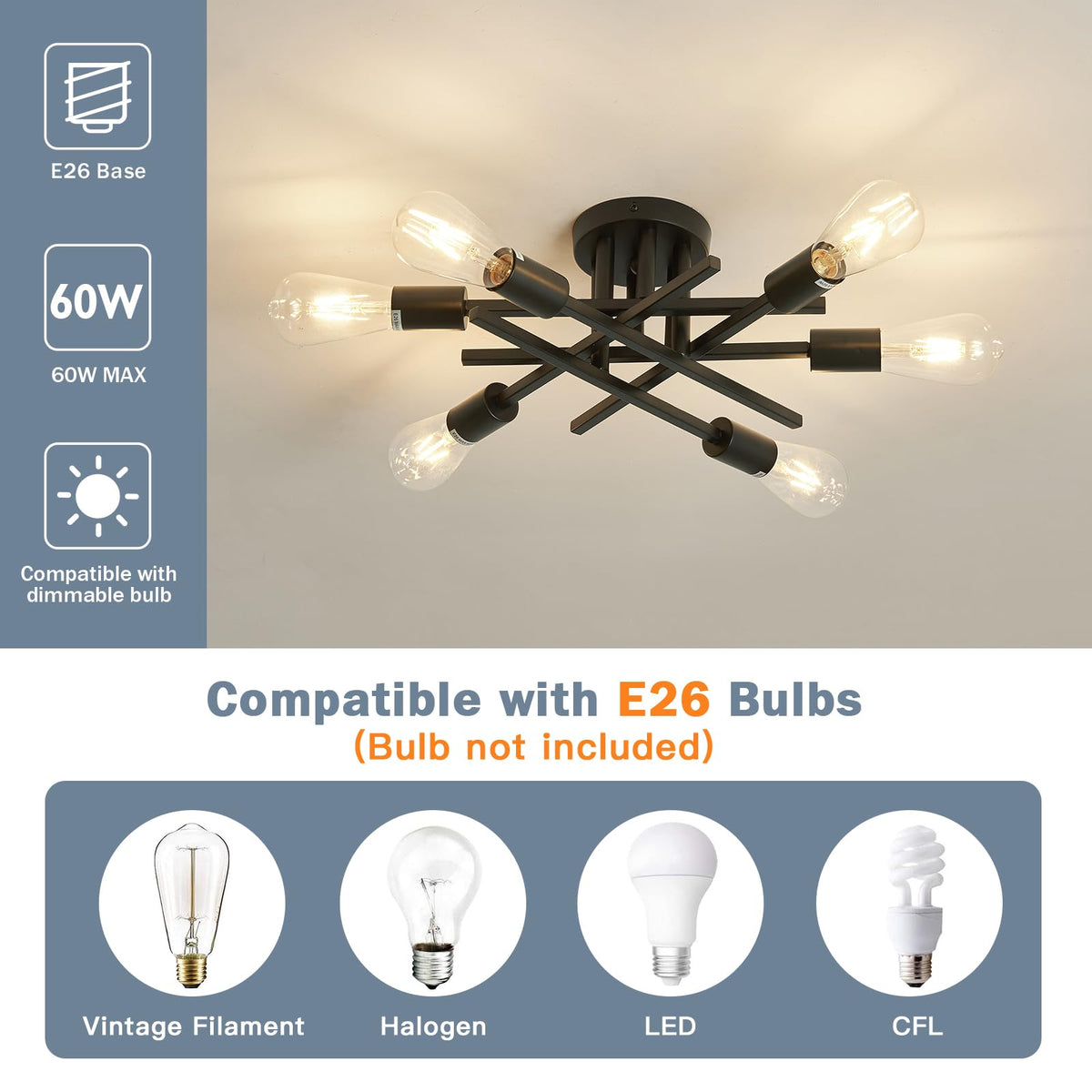Q: What type of bulbs are compatible with this chandelier?A: The ASGYISA chandelier uses E26 base type bulbs, and it can accommodate bulbs with a wattage of up to 60 watts. Please note that bulbs are not included with the purchase.