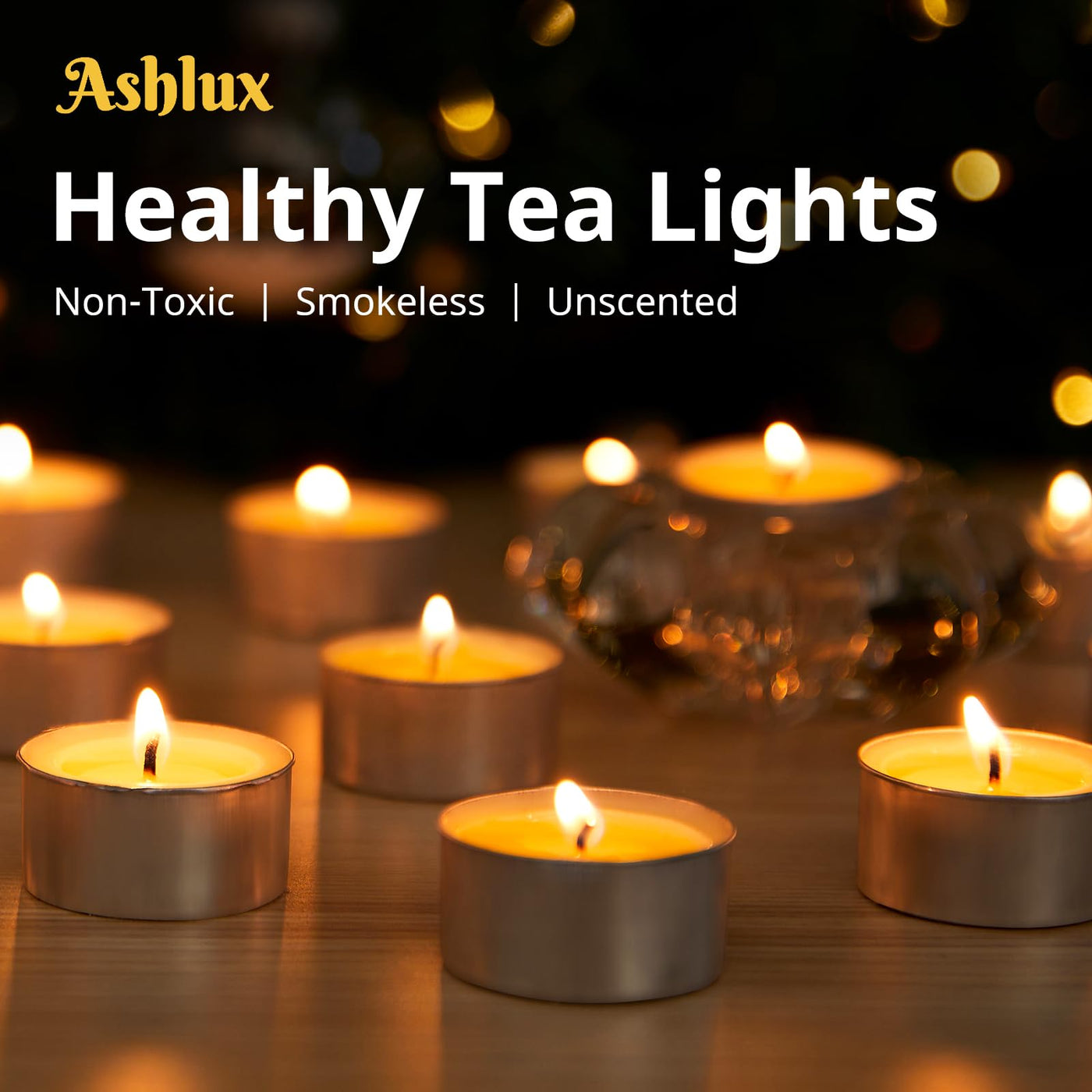 Q: Are these tea lights safe to use indoors?A: Yes, Ashlux tea lights are made from non-toxic, vegetable-based palm wax and are smokeless, making them safe for indoor use and ideal for creating a cozy ambiance.
