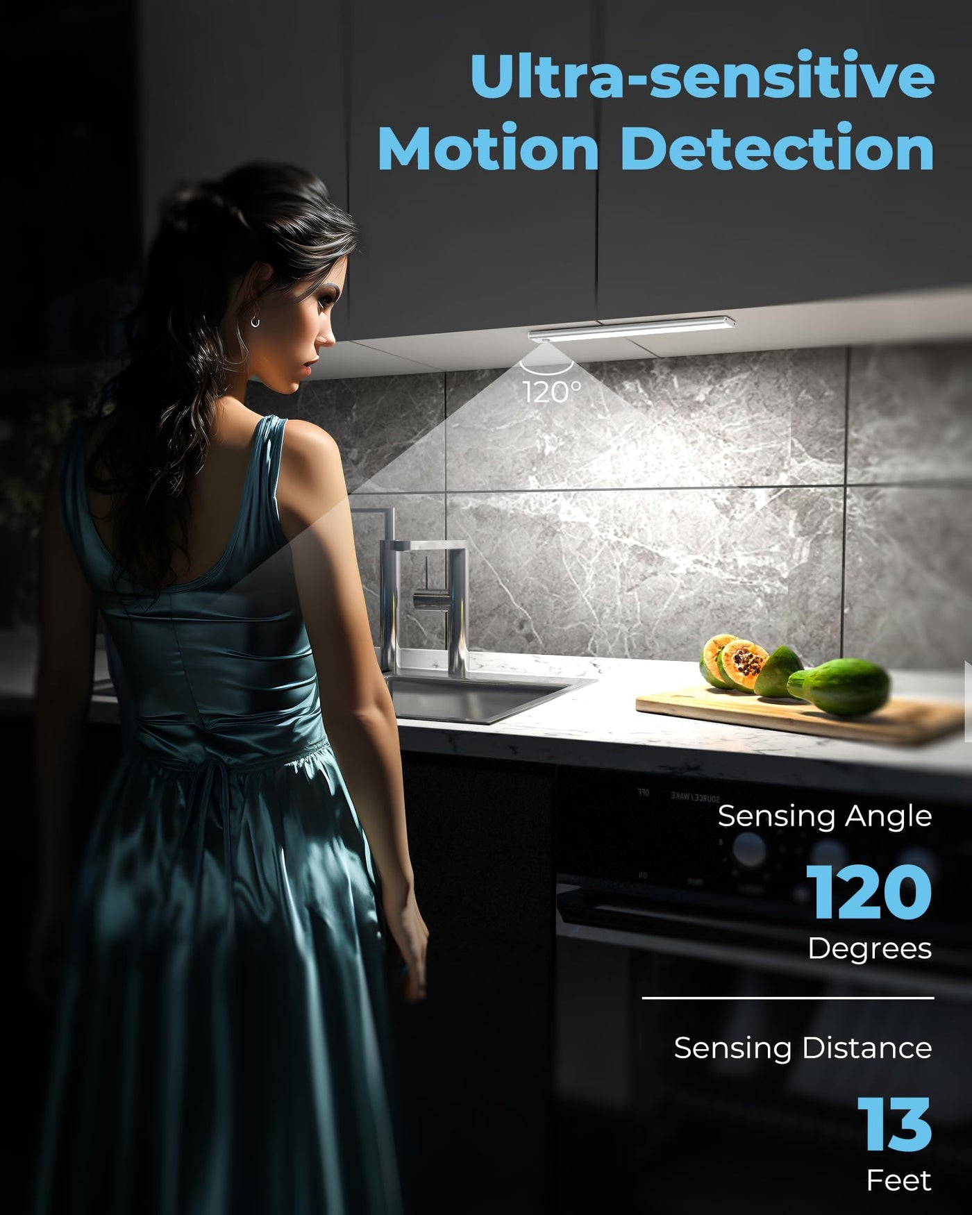Q: How do the ASOKO Under Cabinet Lights detect motion?A: The ASOKO Under Cabinet Lights are equipped with a motion sensor that automatically turns the lights on when it detects movement within a specified range, providing convenient illumination without the need to manually switch them on.