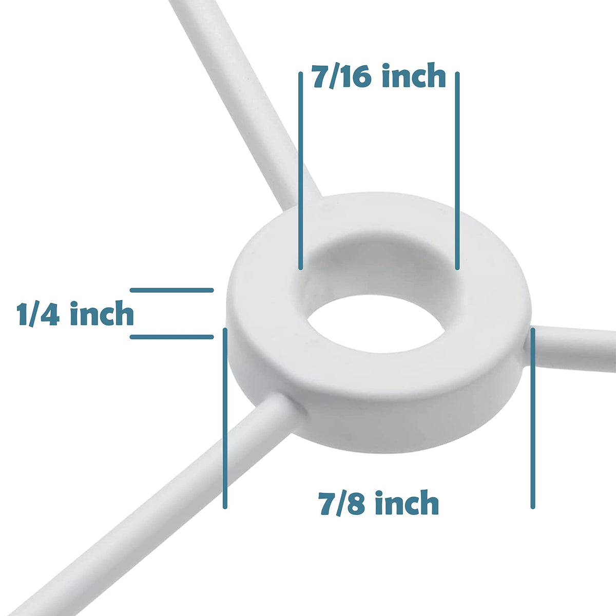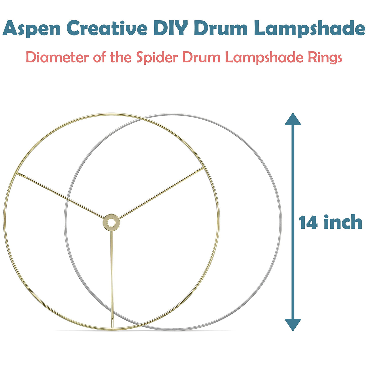 Aspen Creative offers a DIY drum lamp shade rings. Package includes 2 rings to create 1 lamp shade - 1 top ring with with US style spider fitter and 1 bottom plain ring. Top lamp shade ring is brass plated and bottom lamp shade ring is galvanized. Each ring is 14 inches in diameter and 3.55 wire. Top ring has a 7/16 inch fitter designed to attach to a lamp harp. This do-it-yourself kit is used to create a drum/cylinder lamp shade using fabric, paper or any material of your choice. Package is lamp shade rings only, lamp harp and fabric material not included.