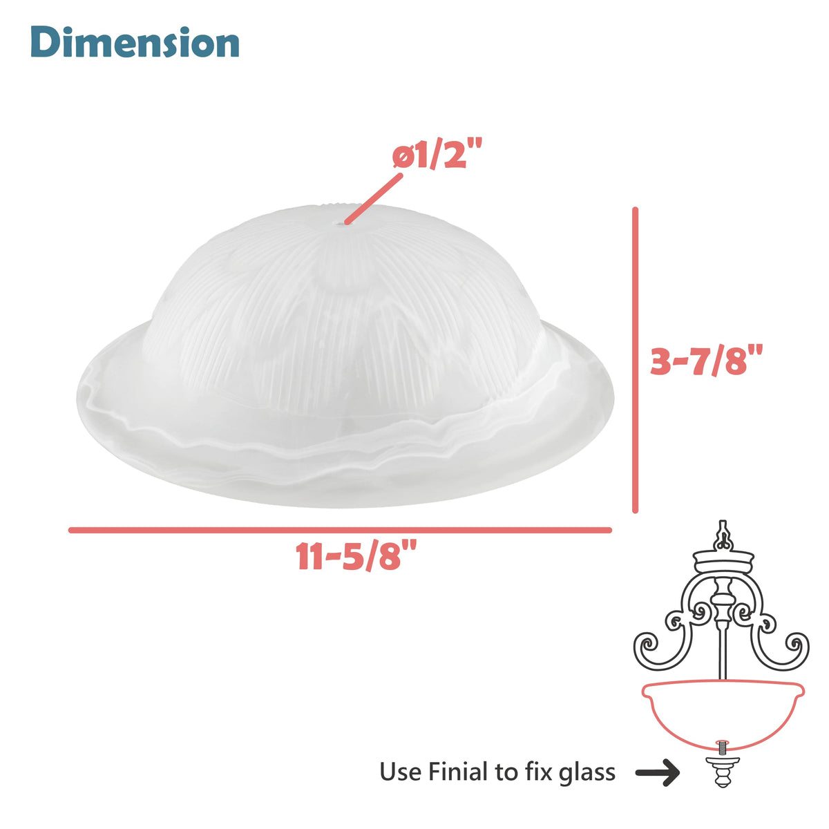 Aspen Creative Item #25016-65-1Aspen Creative Offers An 1-Pack Flush/Semi-Flush Mount Alabaster Glass Replacement Shade.This Shade Is Designed With A 1/2 Inches Fitter And Measures 11-5/8 Inches Bottom, 3-7/8 Inches Height.With Its Easy Installation, Altering The Appearance Of Your Light Fixtures And Regular Maintenance Will Be Effortless.Our Replacement Glass Shades Are Made From High-Quality Glass And Are Heat Resistant, Guaranteeing Durability And Stability. It Also Offers An Original Appearance Of Light Without It Being Overwhelming While Having A Transitional Craftsmanship.The Replacement Glass Shades Are Perfect For Various Lighting Fixtures Like Torchiere Lamps, Swag Lamps, And Pendant Shades With 1/2'' Fitter.