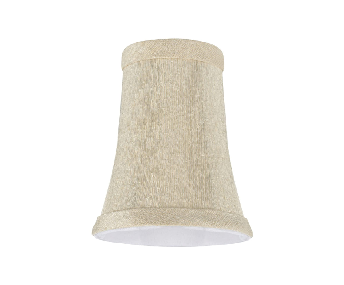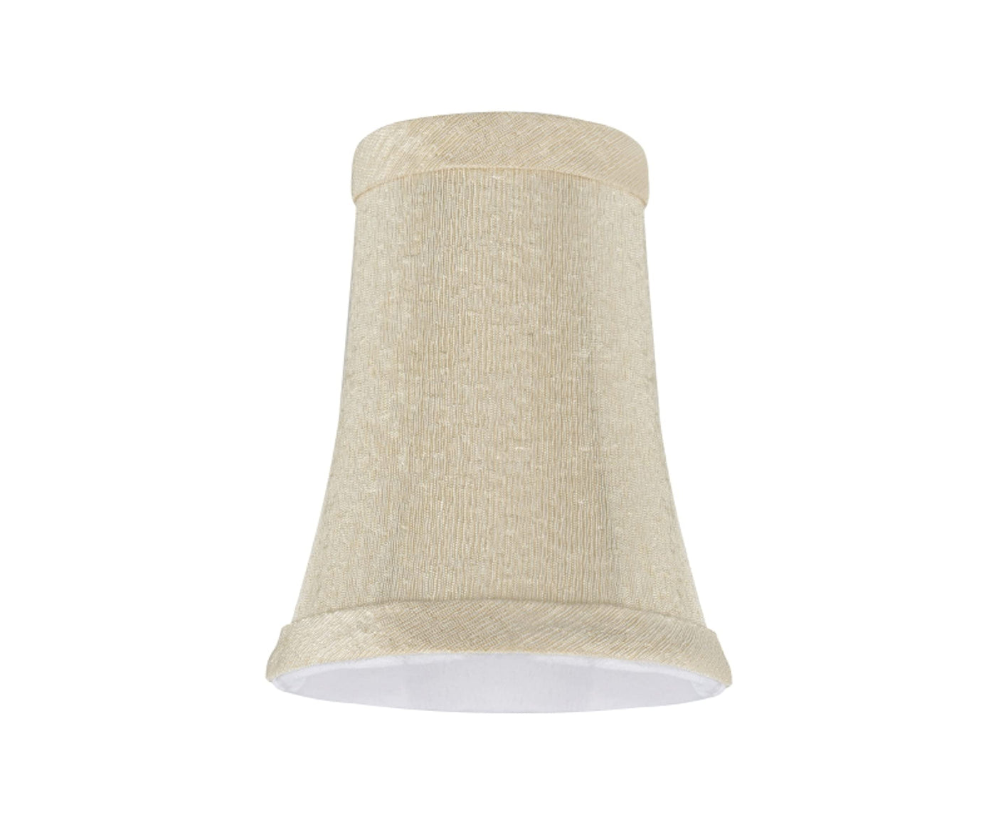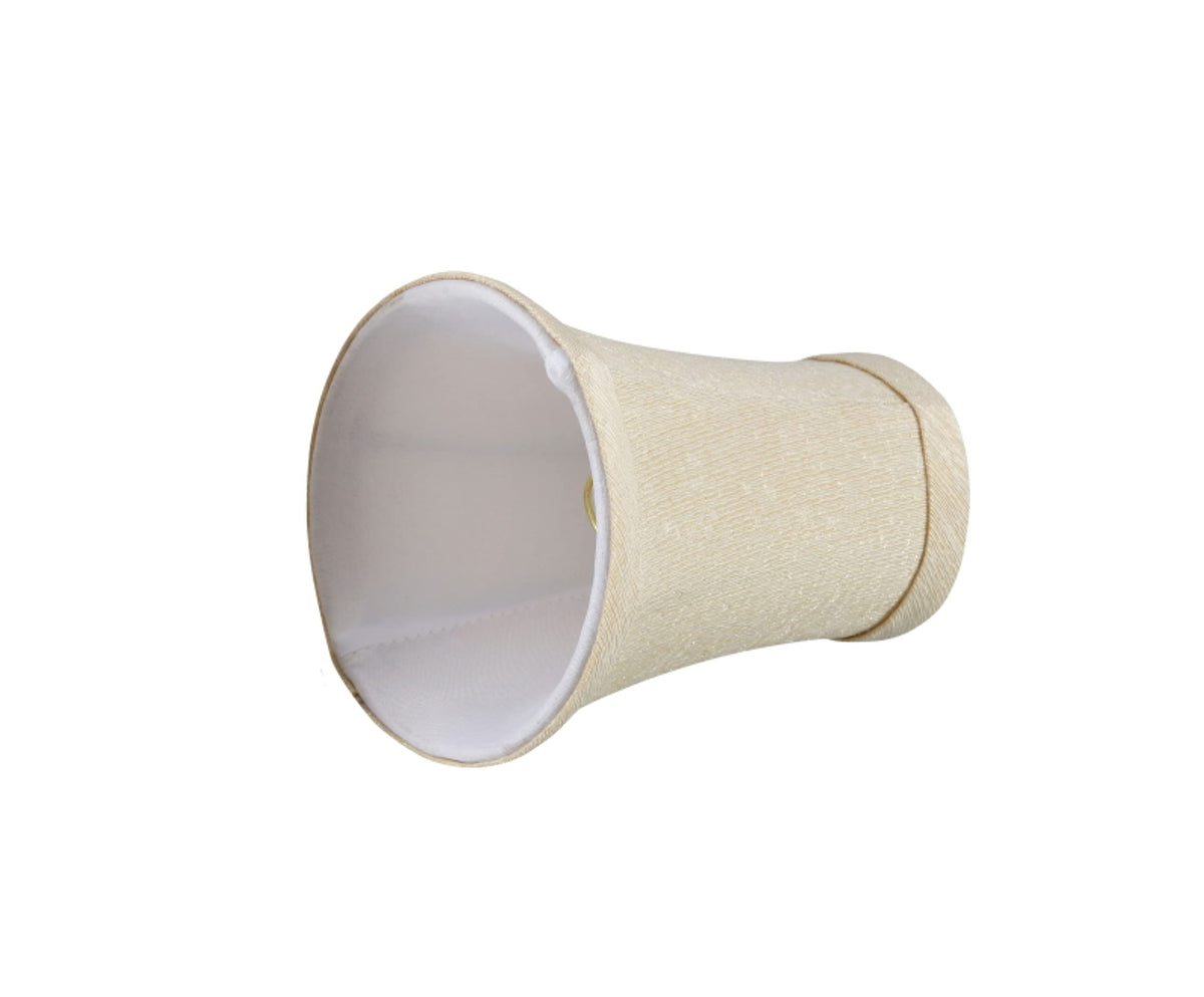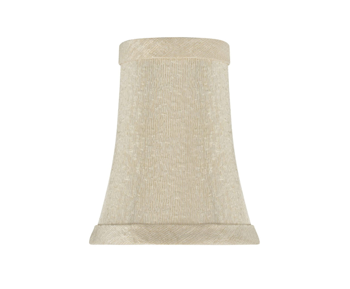 Aspen Creative offers a 6 pack of bell shaped lamp shades with clip on fitter. Made with butter creme colored jacquard textured fabric. The lamp shade dimensions are 2 1/2 inch top, 4 inch bottom, 5 inch slant height. Clip-on style fitter designed for bare bulbed chandeliers and wall sconces that use candelabra bulbs, bent tip style bulbs not recommended (not included). Recommended for use with 40 watt light bulb.