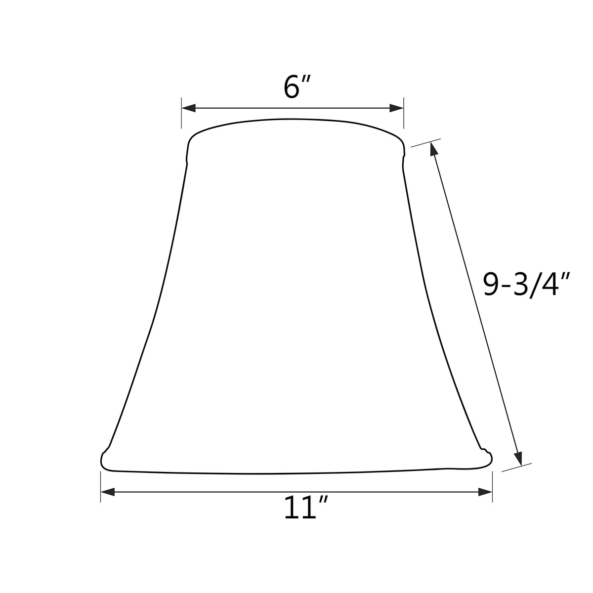 Q: What are the dimensions of the Aspen Creative 30040A lamp shade?A: The Aspen Creative 30040A lamp shade measures 6 inches at the top, 11 inches at the bottom, and has a slant height of 9 3/4 inches.