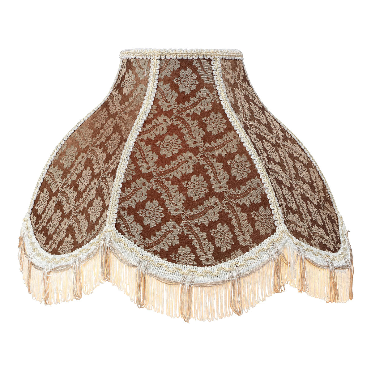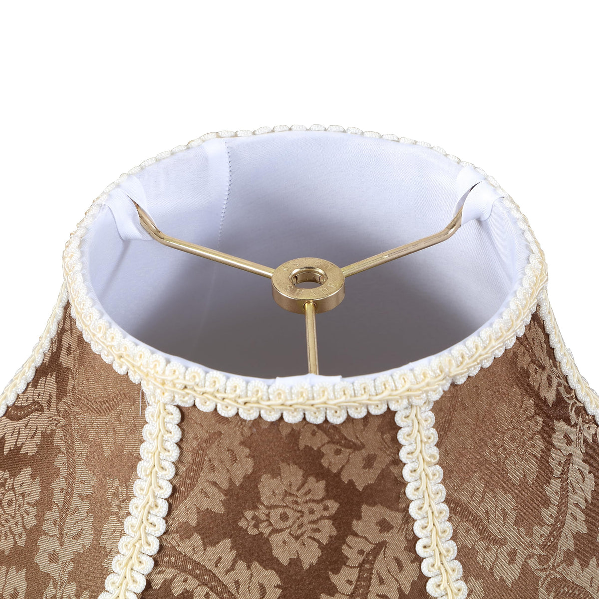 Aspen Creative Item #30308Aspen Creative offers a 1 pack scallop bell shaped spider lamp shade in brown with a beige trim that will enhance your living space.Shade Dimensions: 6" Top x 17" Bottom x 12" Slant Height.The shade is made with a spider construction, this allows the shade to sit perfectly centered on a lamp harp attachment. It is compatible with a saddle base, and uno slip-on base lamp harp or a bulb clip adapter.Crafted with precision and attention to detail, our lamp shades are made with high-quality materials that are built to last. They are made to withstand daily use while still maintaining their shape and beauty.This product is suitable for a wide range of lighting options including table lamps, accent lamps, vintage lamps, candle stick lamps, kid's room lamps, bedroom lamps, bedroom table lamps, night stand lamps, reading lamps, bedside reading lamps, living room end table lamps, bedroom night stand lamps, and pendant lights.
