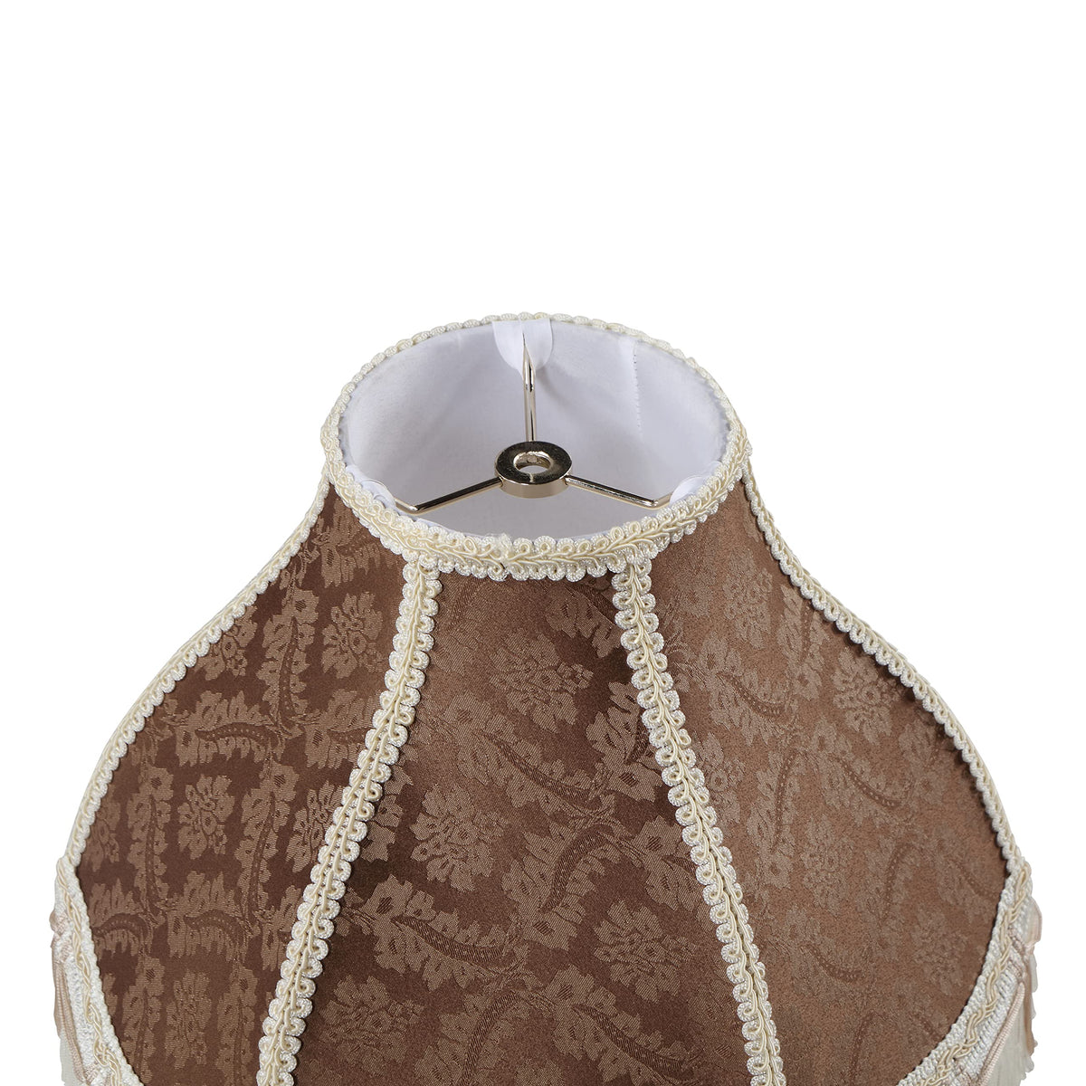 Aspen Creative offers a 1 pack handsewn scallop dome replacement lamp shade in brown. Made with jacquard textured fabric with fringe. The lamp shade size is 5 inch top, 13 inch bottom and 9-1/2 inch slant height. This lamp shade is a spider construction which is designed to attach to a lamp harp. Suitable for table lamps, accent lamps, vintage lamps, candle stick lamps, kid's room lamps, bedroom lamps, bedroom table lamps, night stand lamps, reading lamps, bedside reading lamps, living room end table lamps and bedroom night stand lamps.