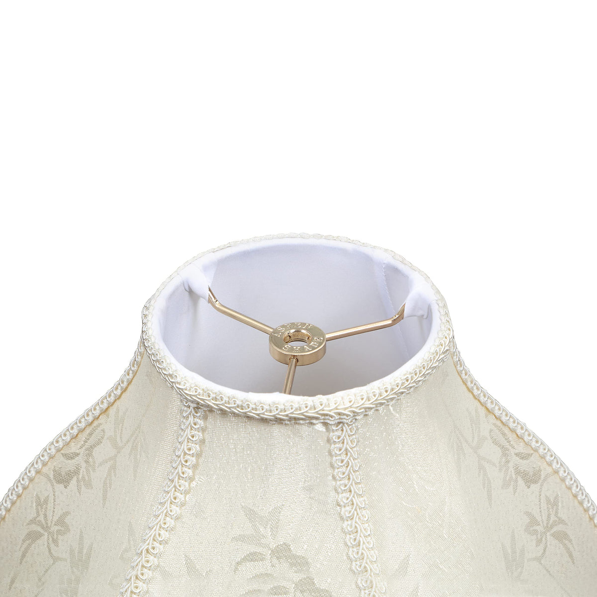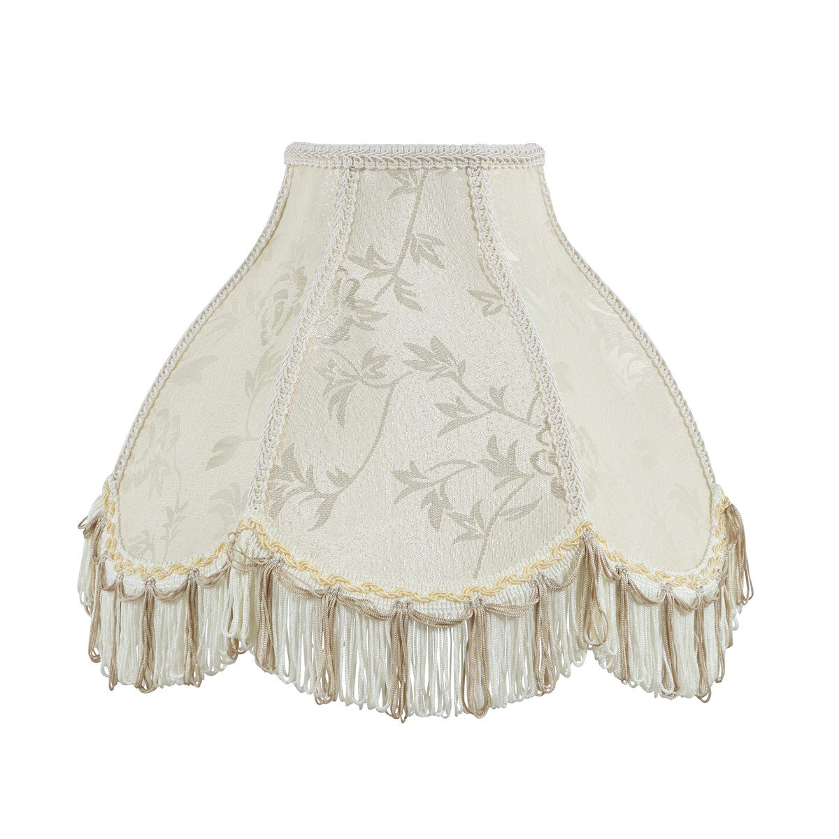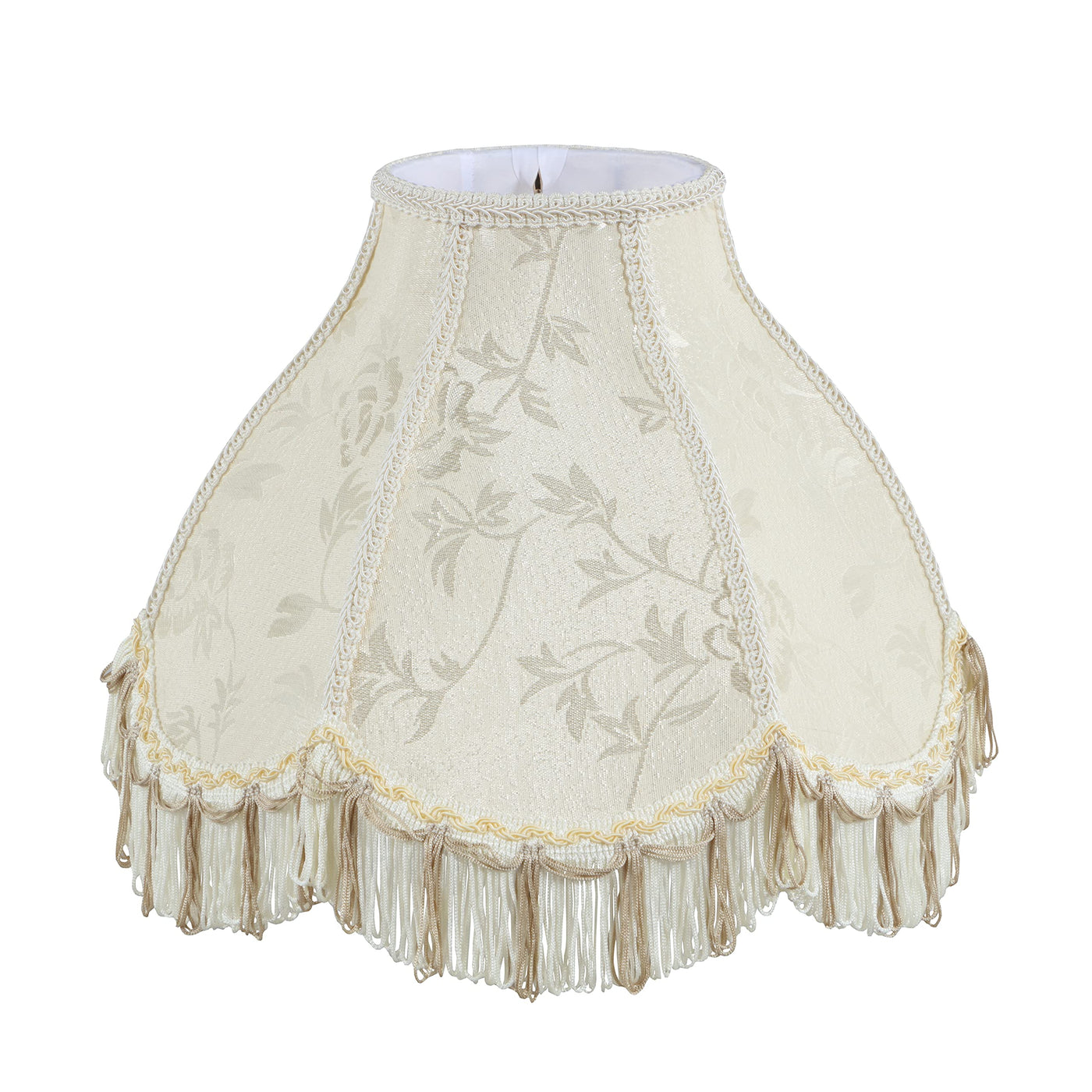 Aspen Creative offers a 1 pack of bell shaped lamp shades with spider fitter. Made with ivory colored jacquard textured fabric with fringe & floral pattern. The lamp shade dimensions are 5 inch top, 13 inch bottom, 9 1/2 inch slant height. This lamp shade is a spider construction which is designed to attach to a lamp harp. Suitable for table lamps, accent lamps, vintage lamps, candle stick lamps, kid's room lamps, bedroom lamps, bedroom table lamps, night stand lamps, reading lamps, bedside reading lamps, living room end table lamps, bedroom night stand lamps and pendant lights.