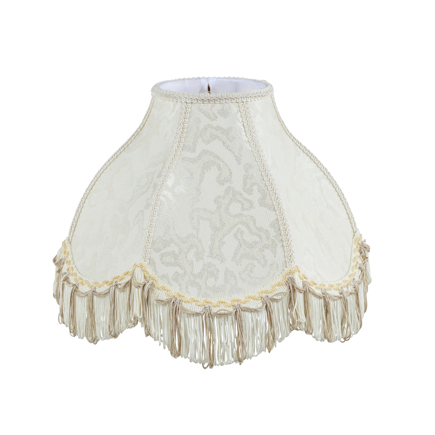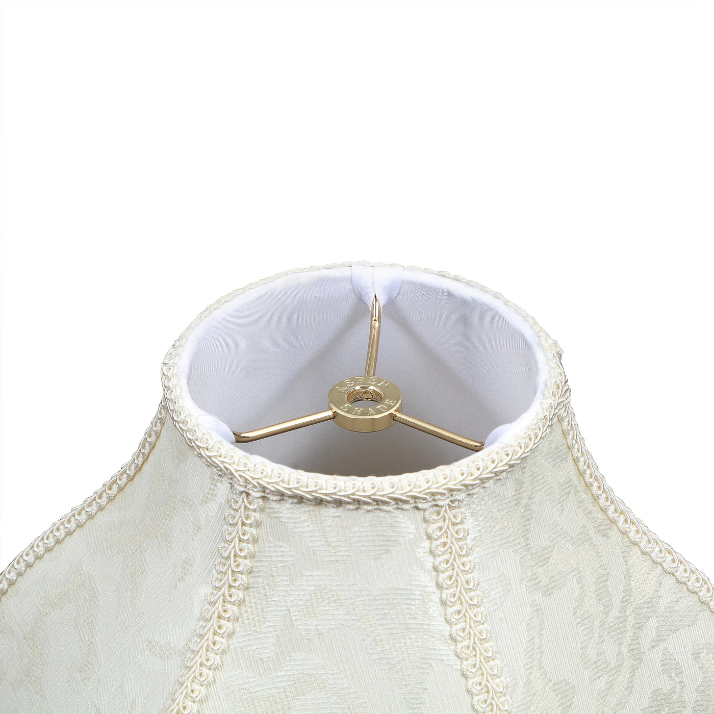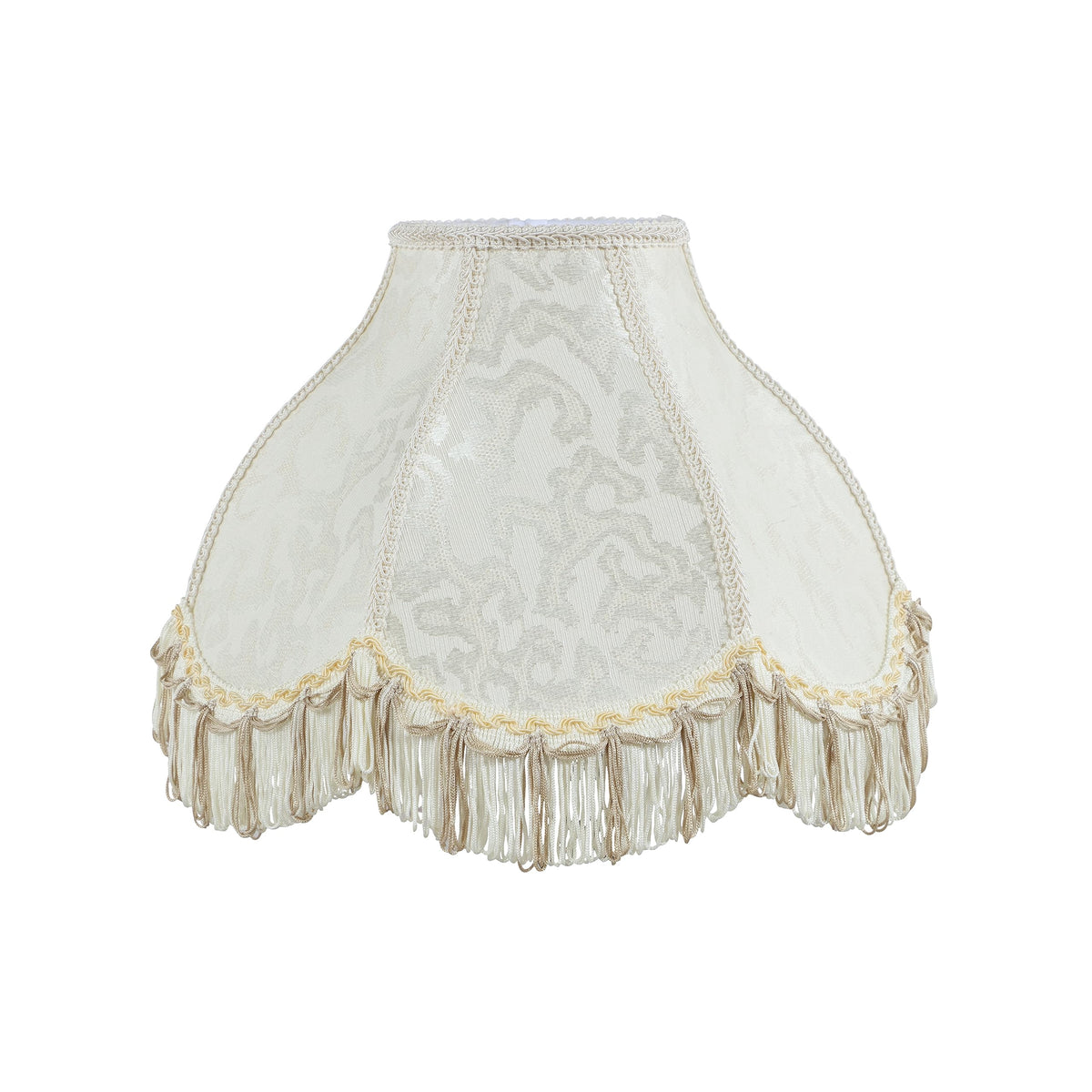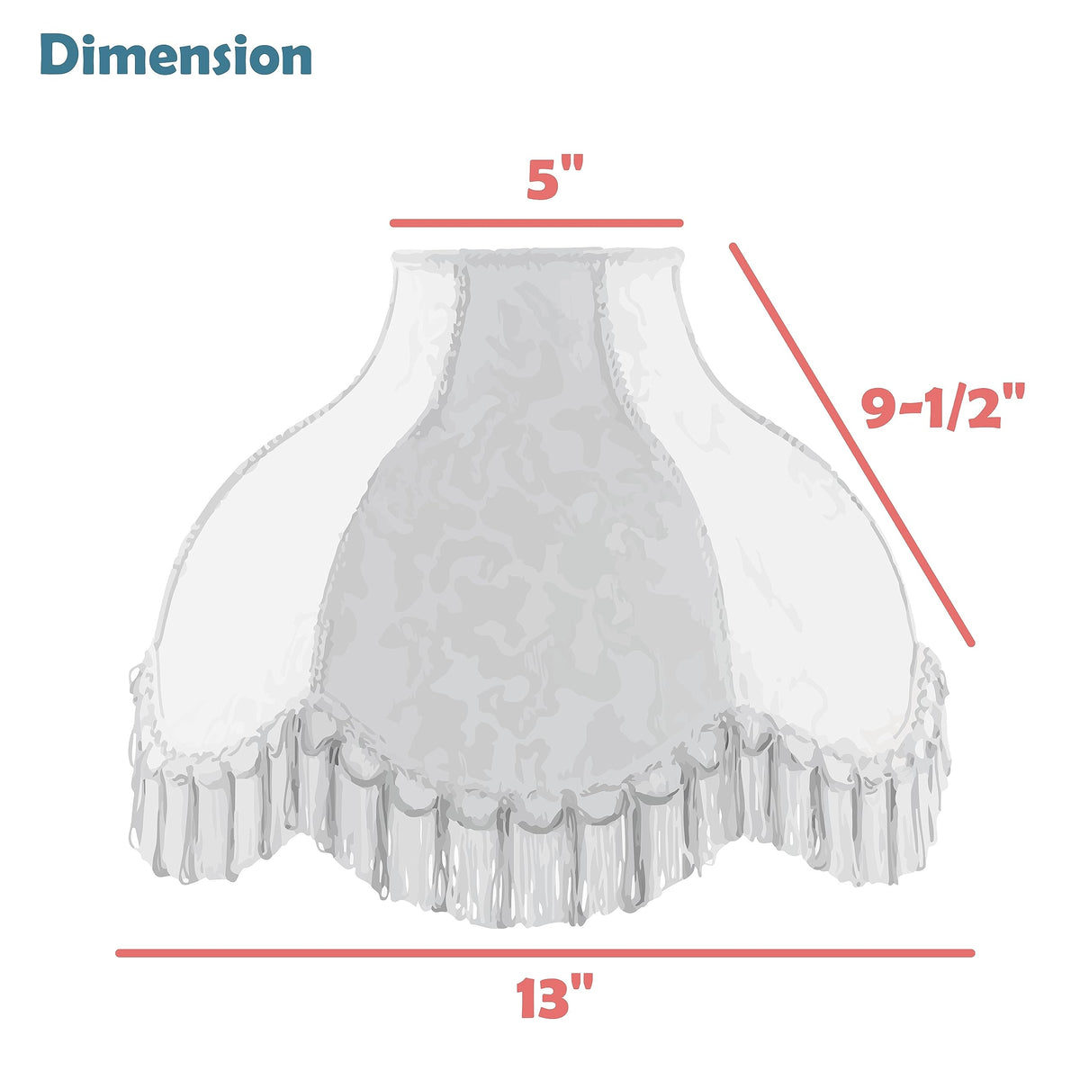 Aspen Creative Item #30335Aspen Creative offers a 1 pack scallop bell shaped spider lamp shade in ivory that will enhance your living space.Shade Dimensions: 5" Top x 13" Bottom x 9 1/2" Slant Height.The shade is made with a spider construction, this allows the shade to sit perfectly centered on a lamp harp attachment. It is compatible with a saddle base, and uno slip-on base lamp harp or a bulb clip adapter.Crafted with precision and attention to detail, our lamp shades are made with high-quality materials that are built to last. They are made to withstand daily use while still maintaining their shape and beauty.This product is suitable for a wide range of lighting options including table lamps, accent lamps, vintage lamps, candle stick lamps, kid's room lamps, bedroom lamps, bedroom table lamps, night stand lamps, reading lamps, bedside reading lamps, living room end table lamps, bedroom night stand lamps, and pendant lights.