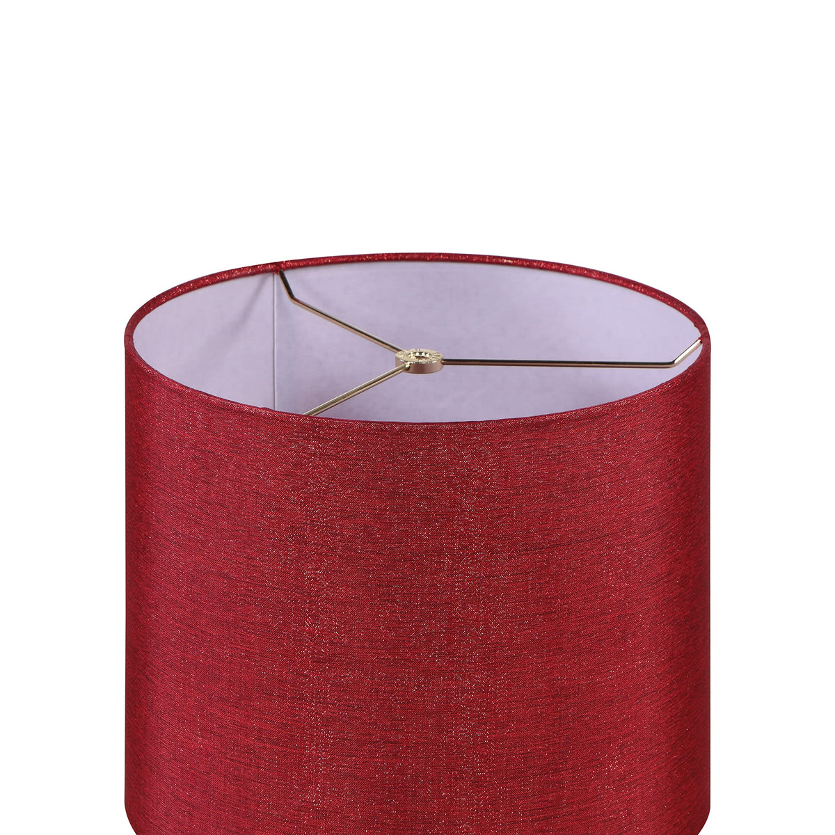 Aspen Creative Item #31107Aspen Creative offers a 1-pack drum-shaped spider lamp shade in rich red that will enhance your living space.Shade Dimensions: 12" Top x 12" Bottom x 10" HeightThe shade is made with a spider construction, this allows the shade to sit perfectly centered on a lamp harp attachment. It is compatible with a saddle base, and uno slip-on base lamp harp or a bulb clip adapter.Crafted with precision and attention to detail, our lamp shades are made with high-quality materials that are built to last. They are made to withstand daily use while still maintaining their shape and beauty.This product is suitable for a wide range of lighting options including table lamps, accent lamps, vintage lamps, candle stick lamps, kid's room lamps, bedroom lamps, bedroom table lamps, night stand lamps, reading lamps, bedside reading lamps, living room end table lamps, bedroom night stand lamps, and pendant lights.