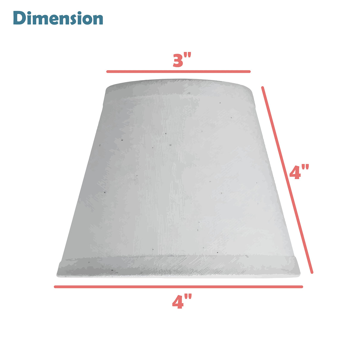 Q: What are the dimensions of the Aspen Creative Empire Clip-On Chandelier Lamp Shade?A: The Aspen Creative Empire Clip-On Chandelier Lamp Shade has dimensions of 3 inches at the top, 4 inches at the bottom, and a slant height of 4 inches.