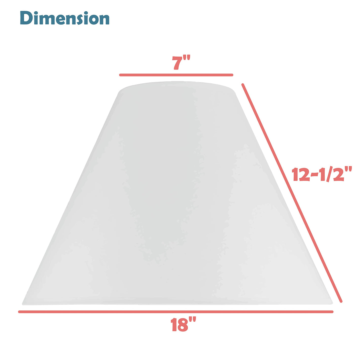 Q: What are the dimensions of the Aspen Creative 32083 lamp shade?A: The Aspen Creative 32083 lamp shade has a top diameter of 7 inches, a bottom diameter of 18 inches, and a slant height of 12-1/2 inches.