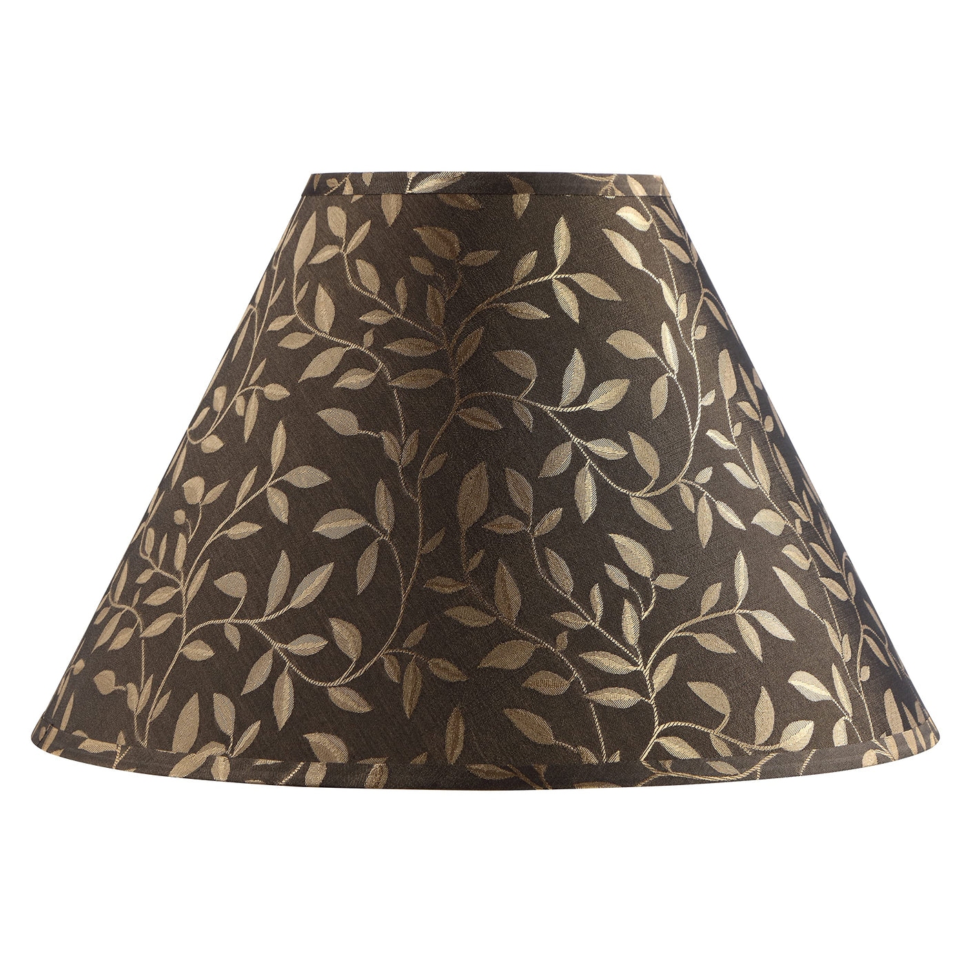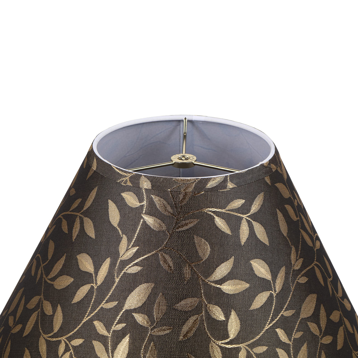 Aspen Creative offers a 1 pack transitional hardback empire lamp shade in brown with gold leaves. Made with jacquard textured fabric. The lamp shade size is 7 inch top, 18 inch bottom and 12-1/2 inch slant height. This lamp shade is a spider construction which is designed to attach to a lamp harp. Suitable for table lamps, accent lamps, vintage lamps, candle stick lamps, kid's room lamps, bedroom lamps, bedroom table lamps, night stand lamps, reading lamps, bedside reading lamps, living room end table lamps and bedroom night stand lamps.