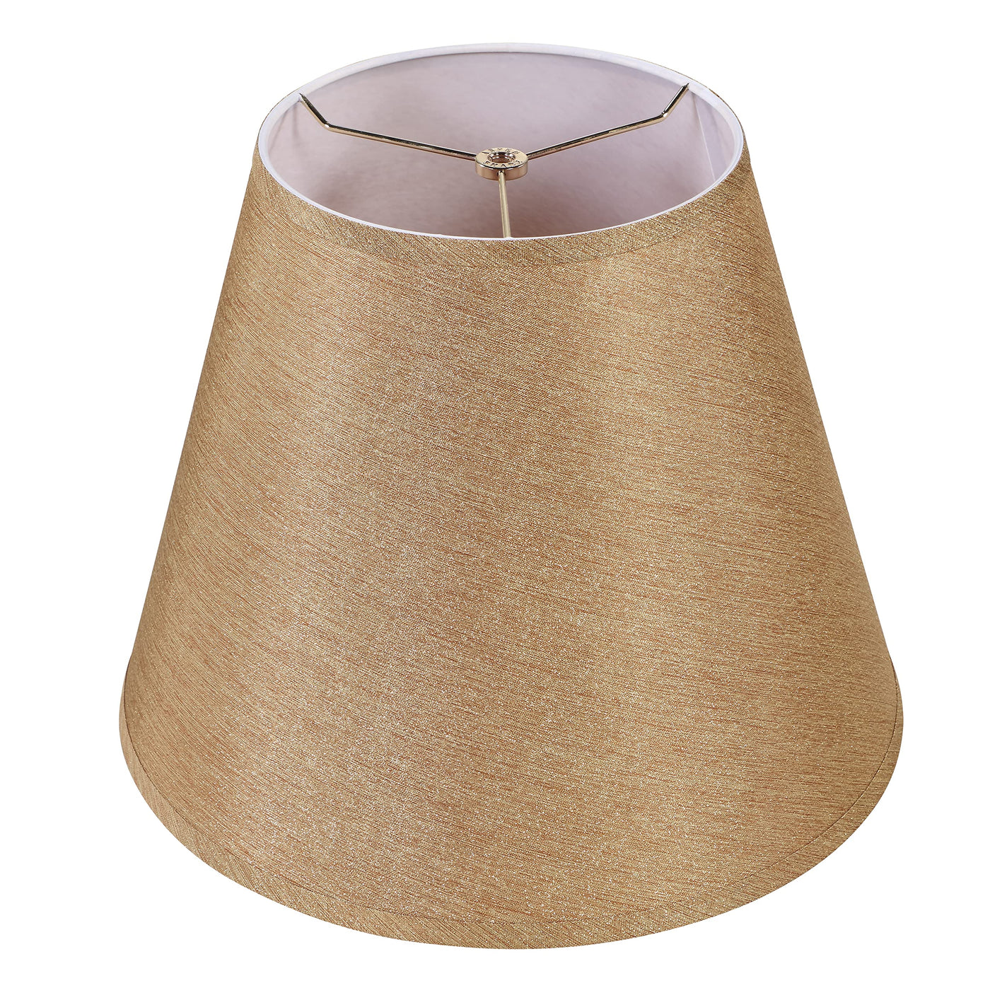 Aspen Creative offers a 1 pack of empire shaped lamp shades with spider fitter. Made with gold brown colored burlap texture fabric with top & bottom trim. The lamp shade dimensions are 9 inch top, 16 inch bottom, 13 inch slant height. This lamp shade is a spider construction which is designed to attach to a lamp harp. Our hardback shades use Virgin Styrene backing board to produce a warm, natural & smooth light – more appealing than shades made with recycled Styrene board that can crack & yellow over time. Suitable for table lamps, accent lamps, vintage lamps, candle stick lamps, kid's room lamps, bedroom lamps, bedroom table lamps, night stand lamps, reading lamps, bedside reading lamps, living room end table lamps, bedroom night stand lamps and pendant lights.
