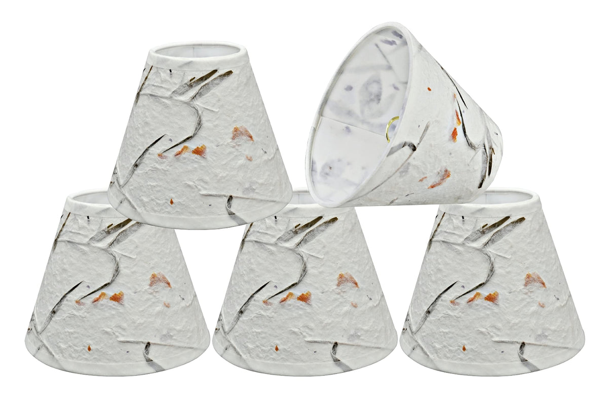 Aspen Creative Item #32115-5Aspen Creative offers a 5-pack empire shaped clip-on lamp shade in off-white that will enhance any space.Shade Dimensions: 3'' Top x 6'' Bottom x 5'' HeightThe shade is made with a clip-on styled fitter that is most compatible with torpedo chandelier light bulbs but can also be used with other bulbs that are similar in size. We recommend that any light bulbs that is used with this product be a candelabra base (E12) or medium base (E26) and 40 wattage maximum, we do not recommend the use of bent tip light bulbs or standard sized light bulbs.Crafted with precision and attention to detail, our lamp shades are made with high-quality materials that are built to last. They are made to withstand daily use while still maintaining their shape and beauty.This product is suitable for a wide range of lighting options including small table lamps, accent lamps, candle stick lamps, chandeliers, and wall sconces, and bedroom night light lamps.