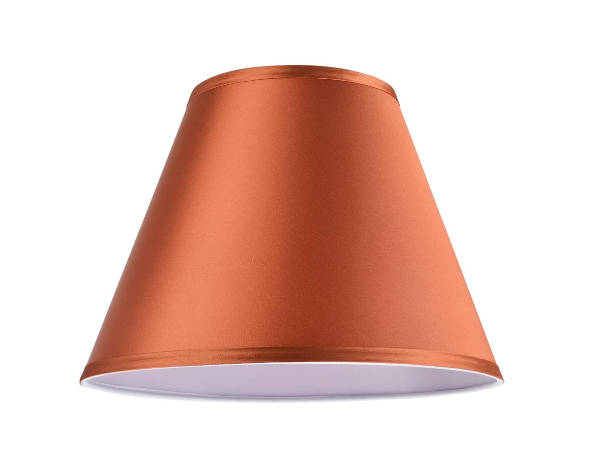 Aspen Creative Item #32193AAspen Creative offers a 1 pack empire shaped spider lamp shade in burnt orange that will enhance your living space.Shade Dimensions: 6" Top x 12" Bottom x 9" Slant Height.The shade is made with a spider construction, this allows the shade to sit perfectly centered on a lamp harp attachment. It is compatible with a saddle base, and uno slip-on base lamp harp or a bulb clip adapter.Crafted with precision and attention to detail, our lamp shades are made with high-quality materials that are built to last. They are made to withstand daily use while still maintaining their shape and beauty.This product is suitable for a wide range of lighting options including table lamps, accent lamps, vintage lamps, candle stick lamps, kid's room lamps, bedroom lamps, bedroom table lamps, night stand lamps, reading lamps, bedside reading lamps, living room end table lamps, bedroom night stand lamps, and pendant lights.