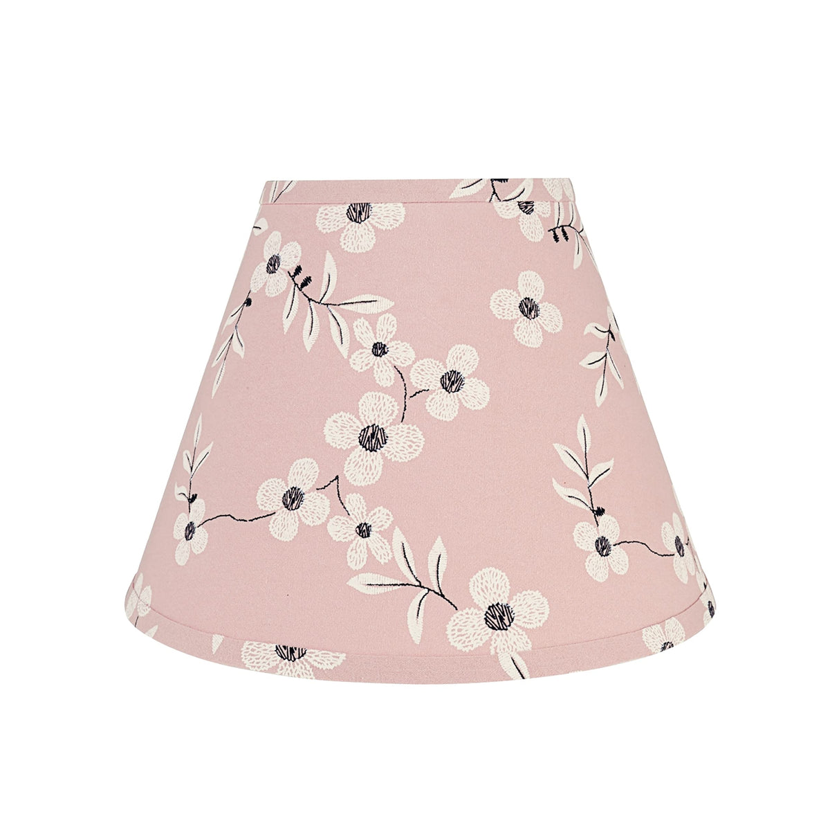Q: What materials are used in the construction of this lamp shade?A: The lamp shade is crafted with high-quality linen featuring a beautiful pink with white and black floral print, and its construction includes a sturdy brass spider fitter.