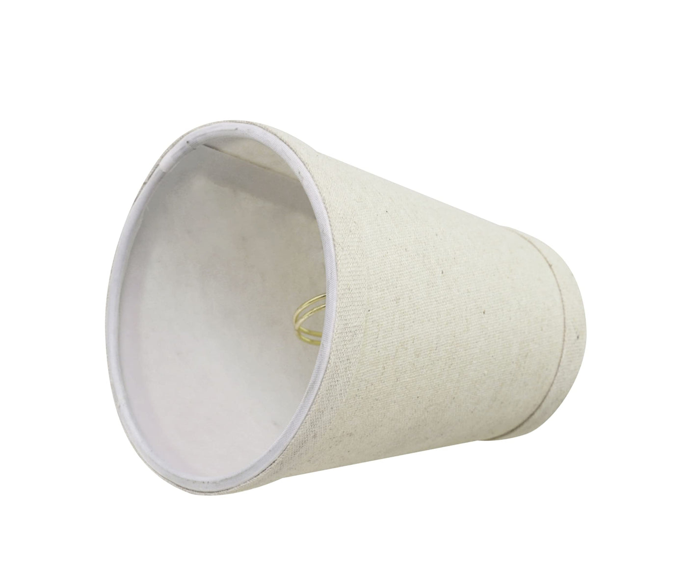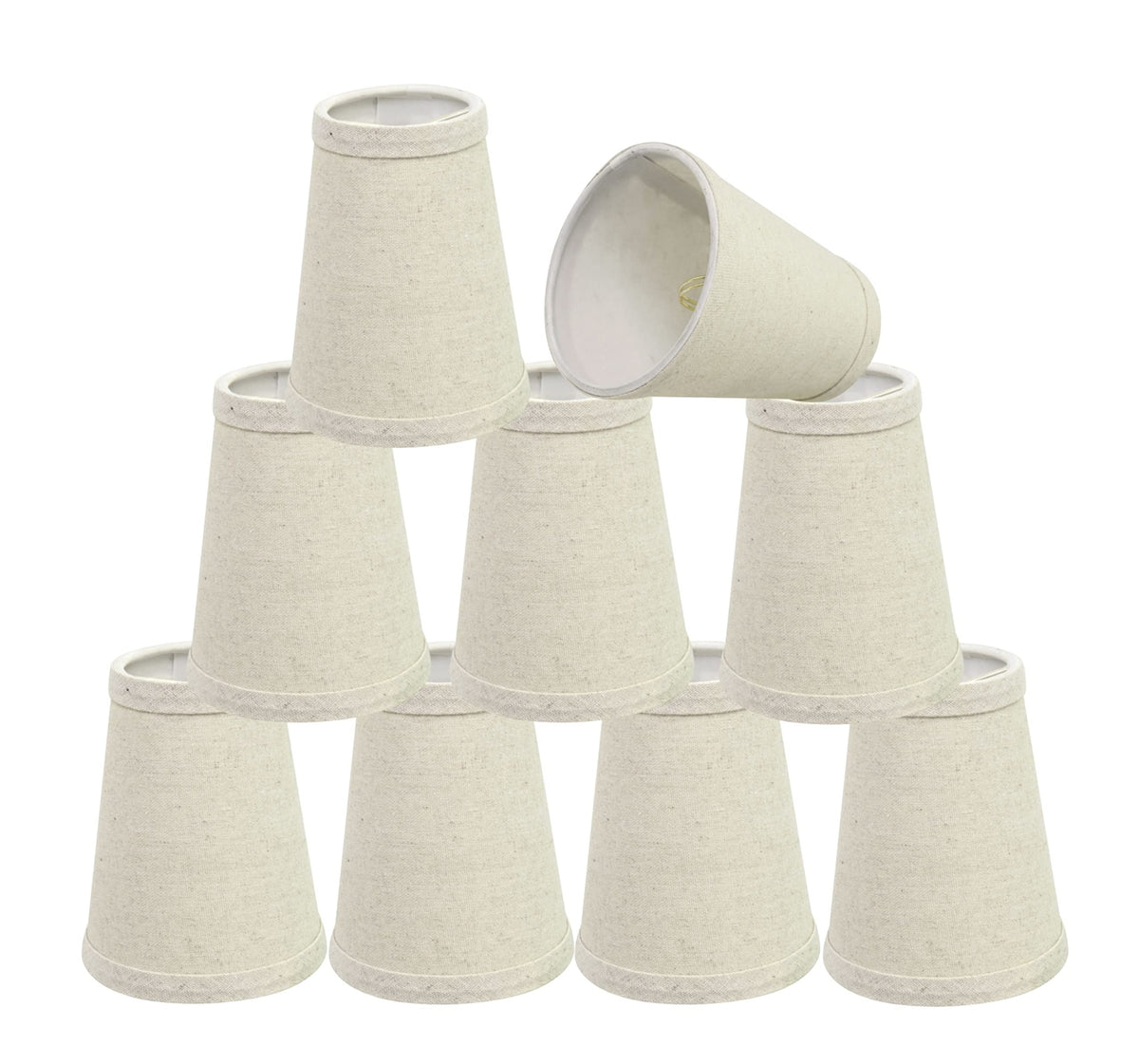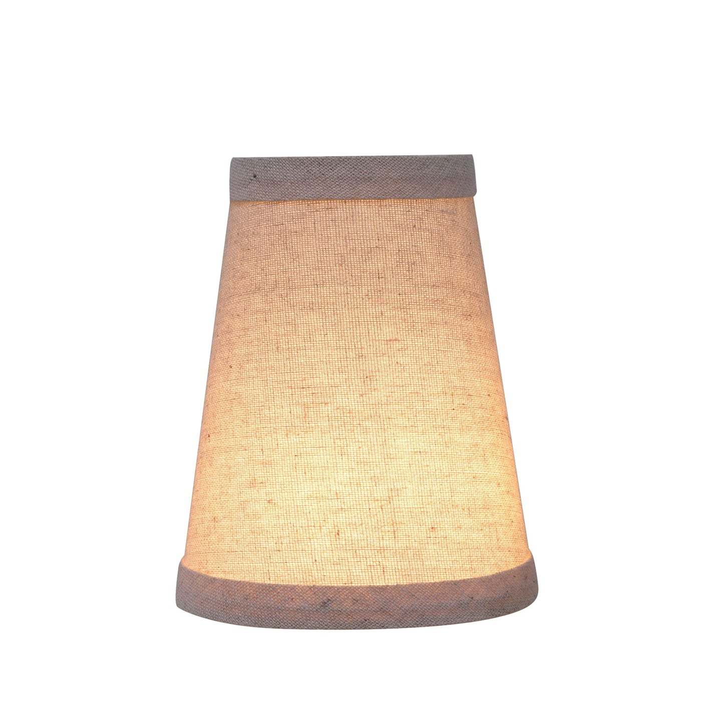 Aspen Creative offers a 6 pack of empire shaped lamp shades with clip on fitter. Made with oatmeal colored linen fabric. The lamp shade dimensions are 2 1/2 inch top, 4 inch bottom, 5 inch slant height. Clip-on style fitter designed for bare bulbed chandeliers and wall sconces that use candelabra bulbs, bent tip style bulbs not recommended (not included). Our hardback shades use Virgin Styrene backing board to produce a warm, natural & smooth light – more appealing than shades made with recycled Styrene board that can crack & yellow over time. Recommended for use with 40 watt light bulb.