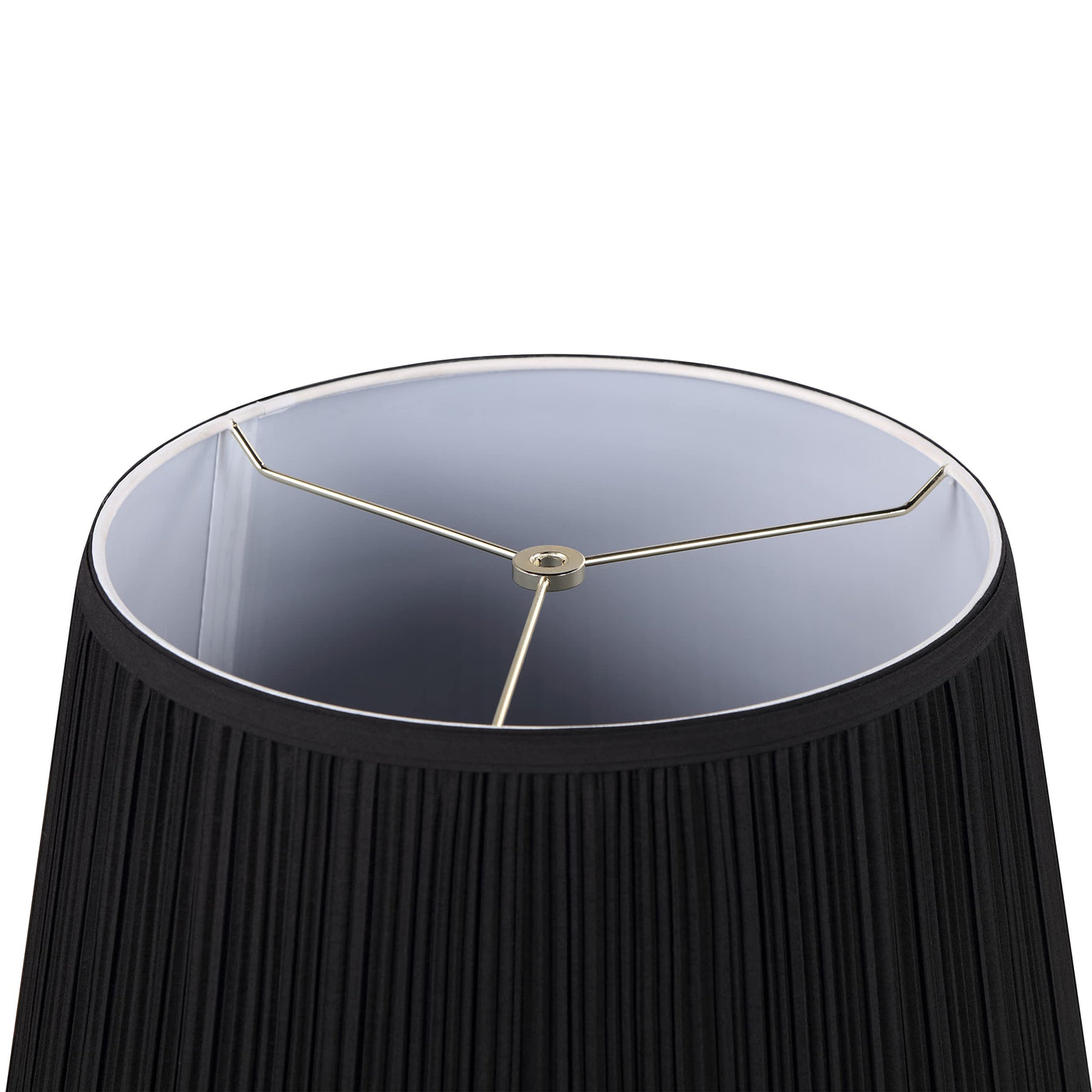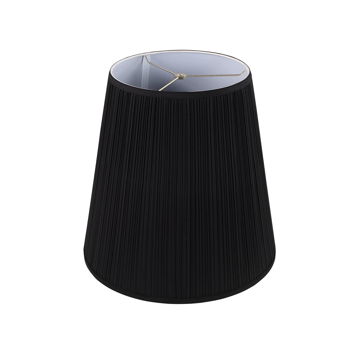 Aspen Creative offers a 1 pack transitional design hardback empire shaped replacement lamp shade in black. Made with pleated fabric. The lamp shade size is 12 inch top x 18 inch bottom x 18 inch slant height. This lamp shade is a spider construction – designed to attach to lamp harp. Applications - For table lamps, accent lamps, vintage lamps, candle stick lamps and kid's room lamps. Our hardback shades use Virgin Styrene backing board to produce a warm, natural & smooth light – more appealing than shades made with recycled Styrene board that can crack & yellow over time.
