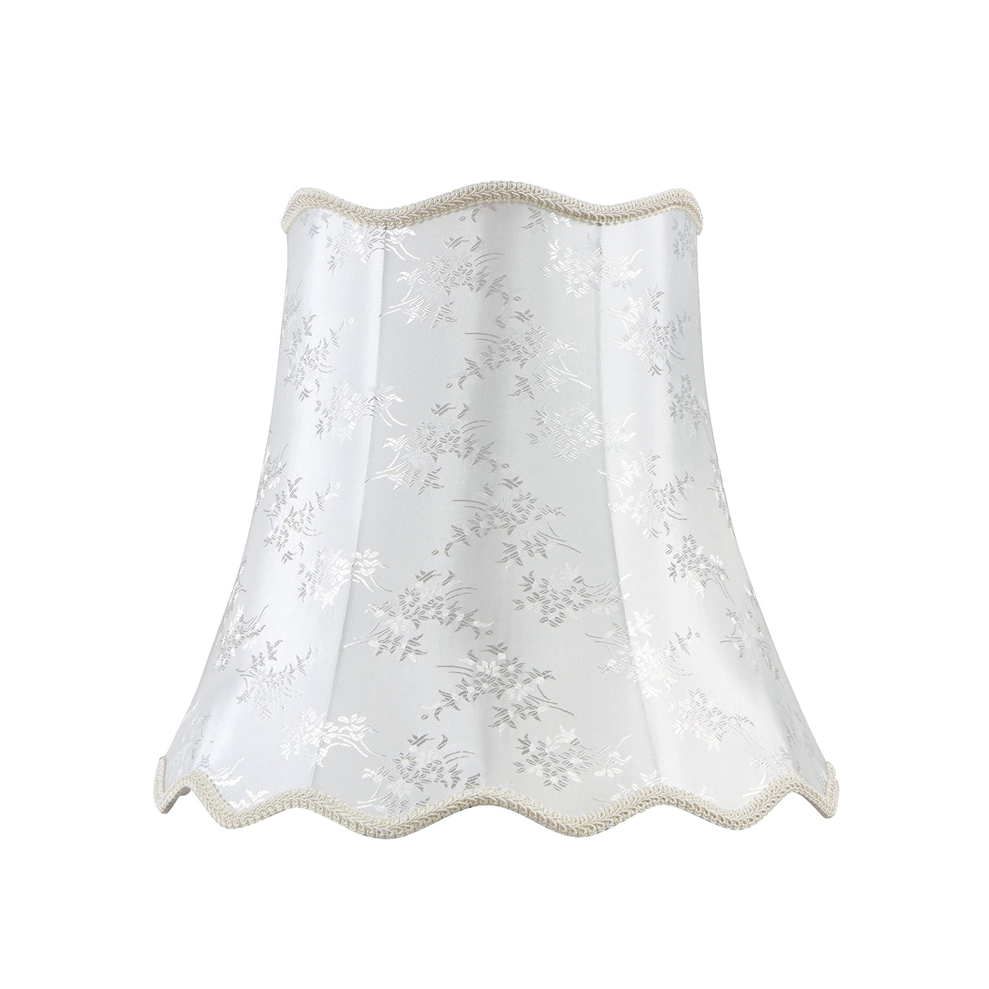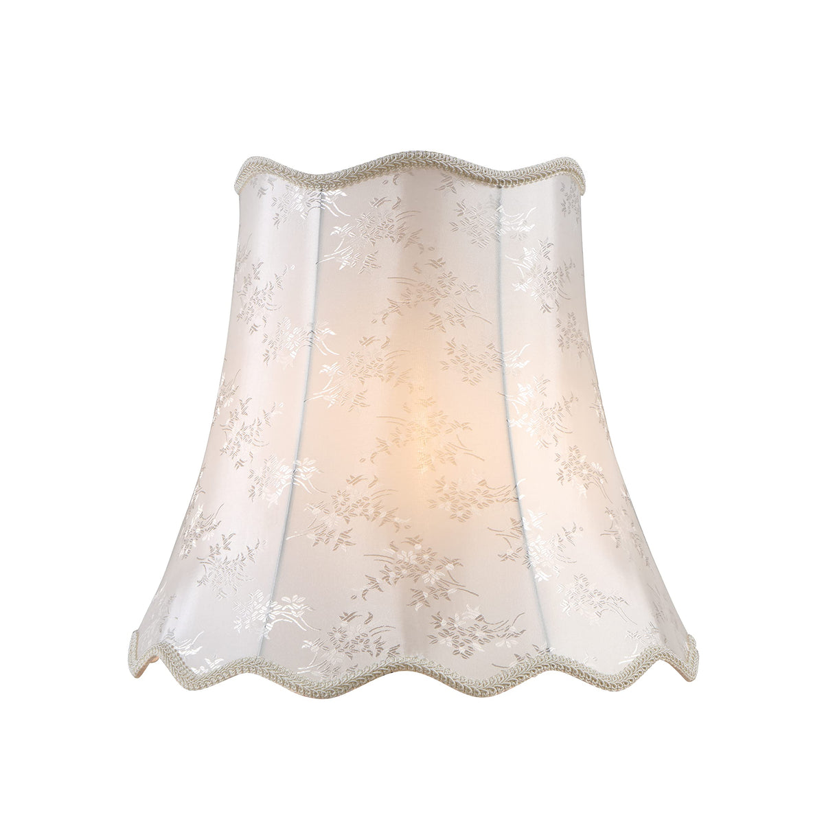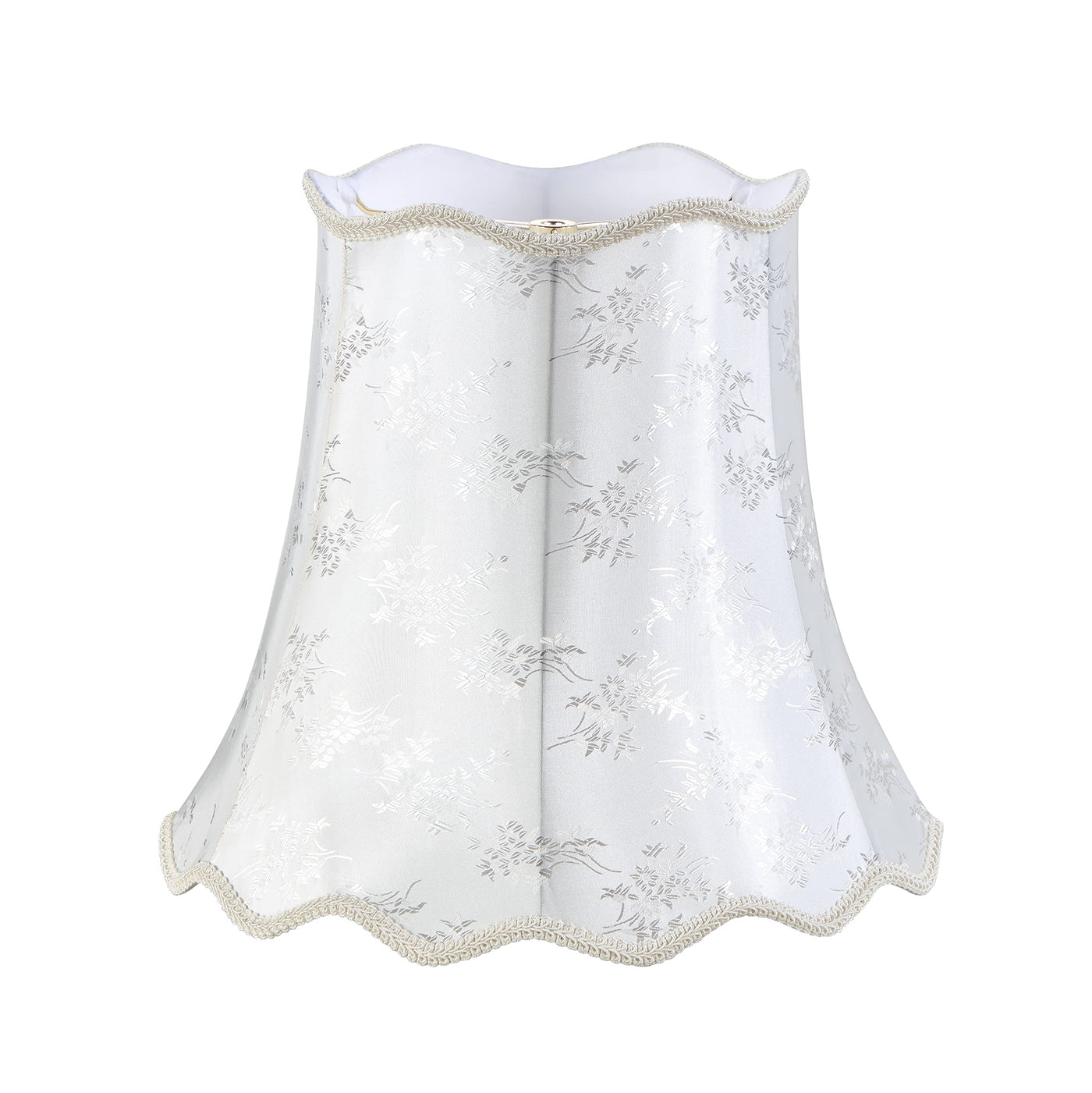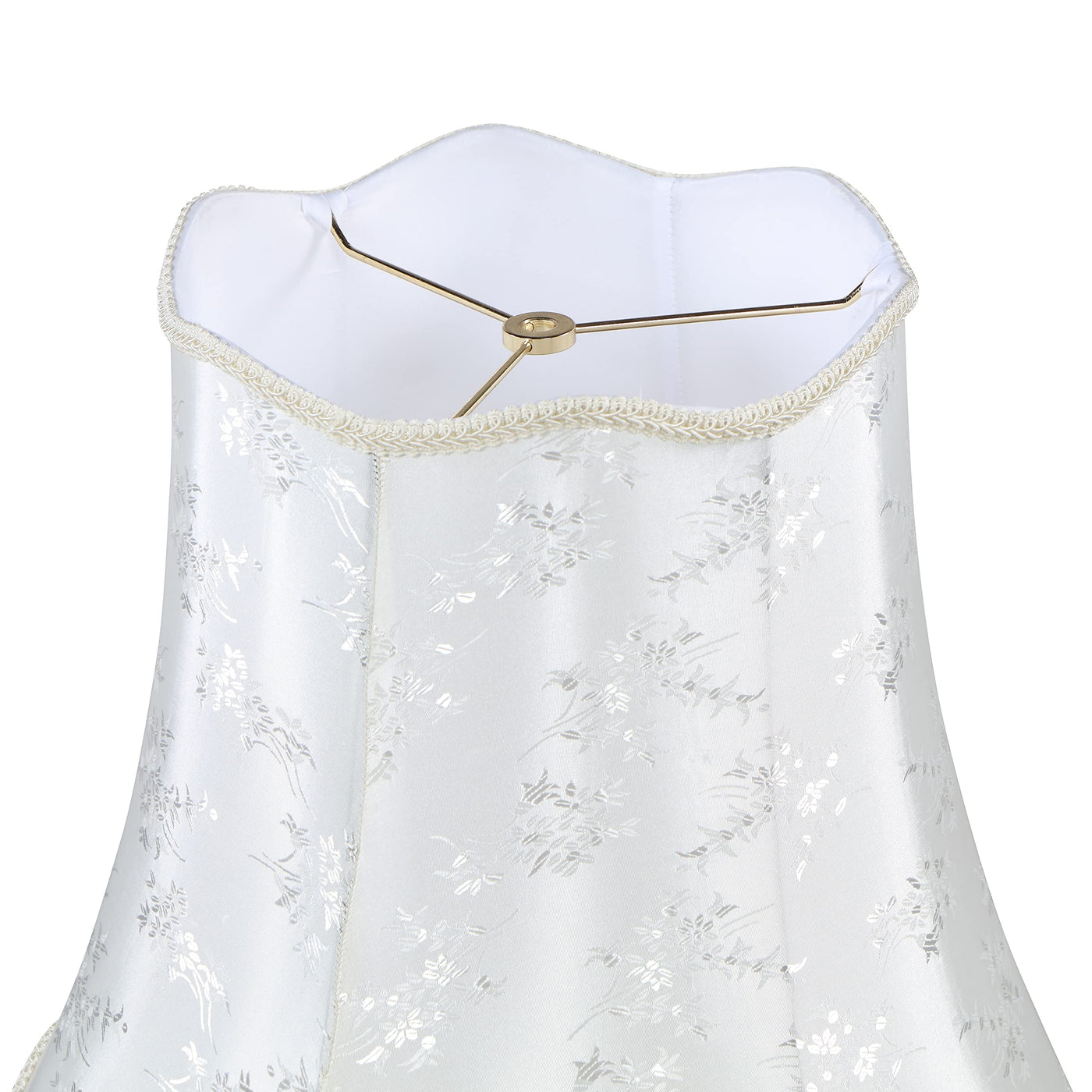 Aspen Creative offers a 1 pack of bell shaped lamp shades with spider fitter. Made with beige colored jacquard textured fabric with flower pattern & top, bottom trim. The lamp shade dimensions are 10 inch top, 16 inch bottom, 15 inch slant height. This lamp shade is a spider construction which is designed to attach to a lamp harp. Suitable for table lamps, accent lamps, vintage lamps, candle stick lamps, kid's room lamps, bedroom lamps, bedroom table lamps, night stand lamps, reading lamps, bedside reading lamps, living room end table lamps, bedroom night stand lamps and pendant lights.