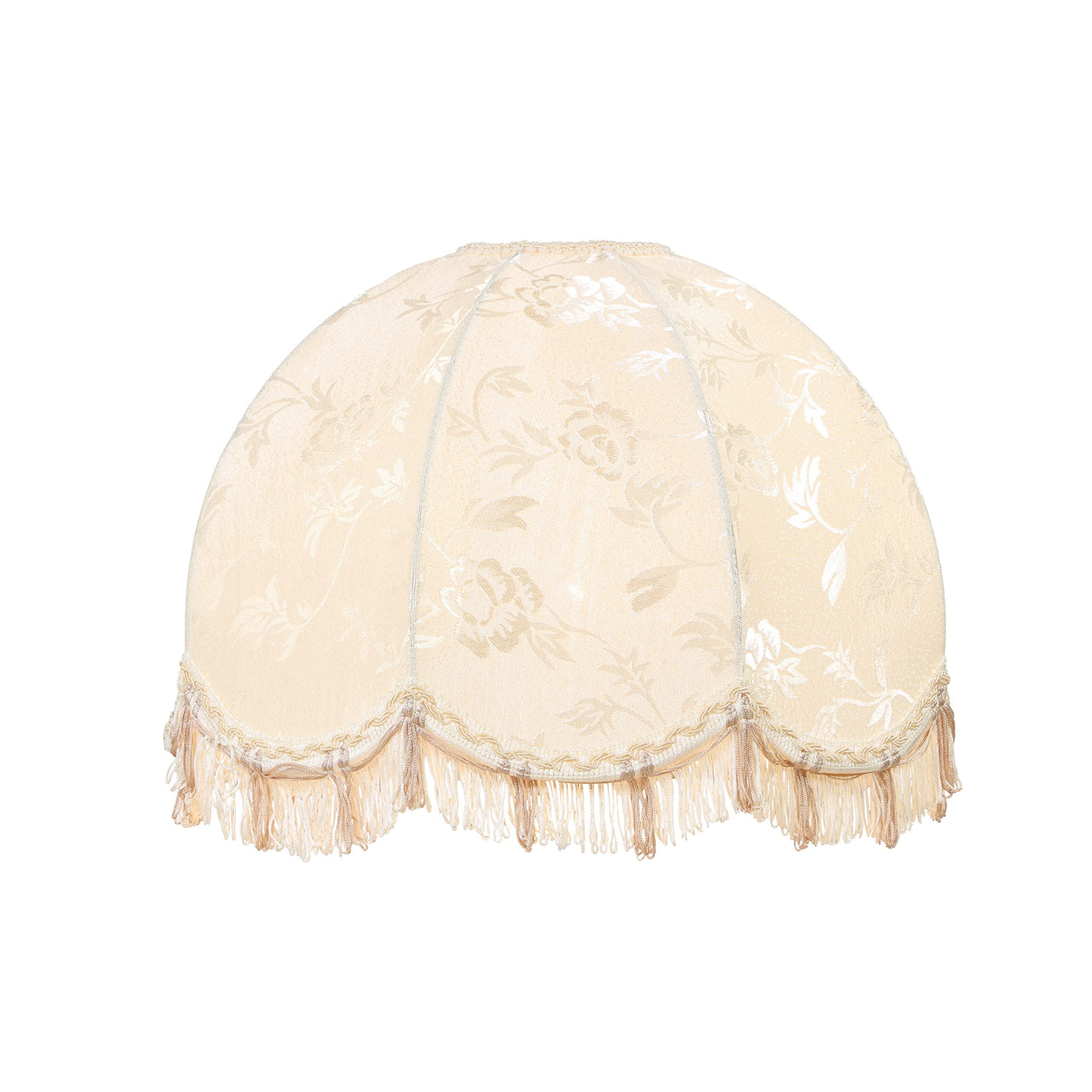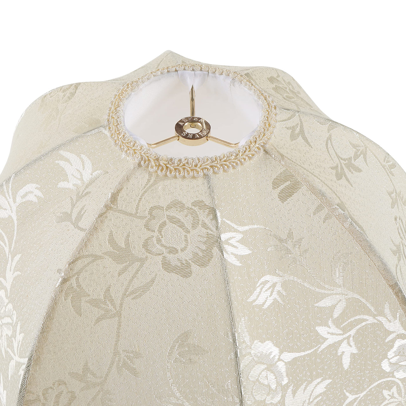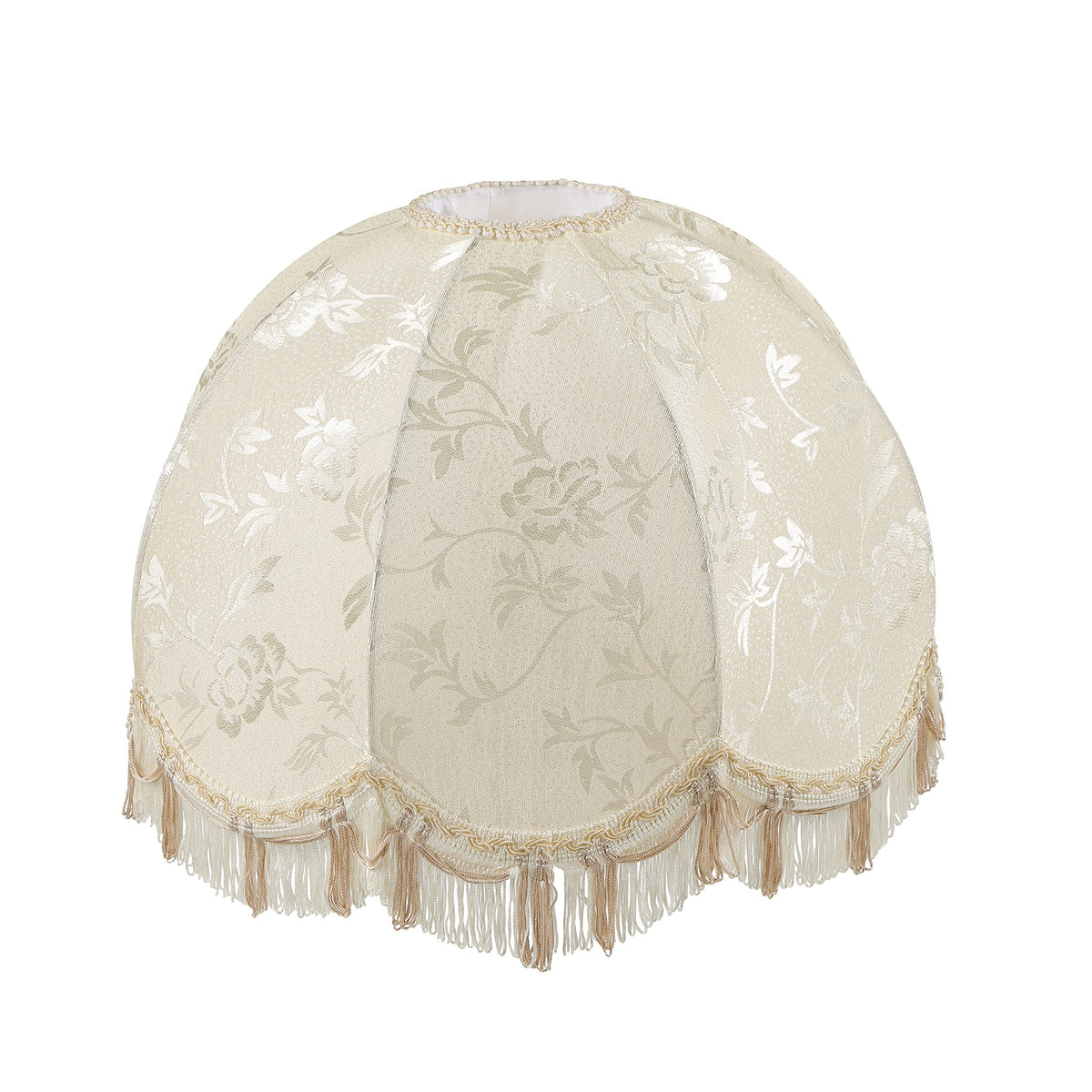 Aspen Creative offers a 1 pack of dome shaped lamp shades with spider fitter. Made with ivory colored jacquard textured fabric with flower pattern & top, bottom trim & fringe. The lamp shade dimensions are 4 inch top, 16 inch bottom, 12 inch slant height. This lamp shade is a spider construction which is designed to attach to a lamp harp. Suitable for table lamps, accent lamps, vintage lamps, candle stick lamps, kid's room lamps, bedroom lamps, bedroom table lamps, night stand lamps, reading lamps, bedside reading lamps, living room end table lamps, bedroom night stand lamps and pendant lights.