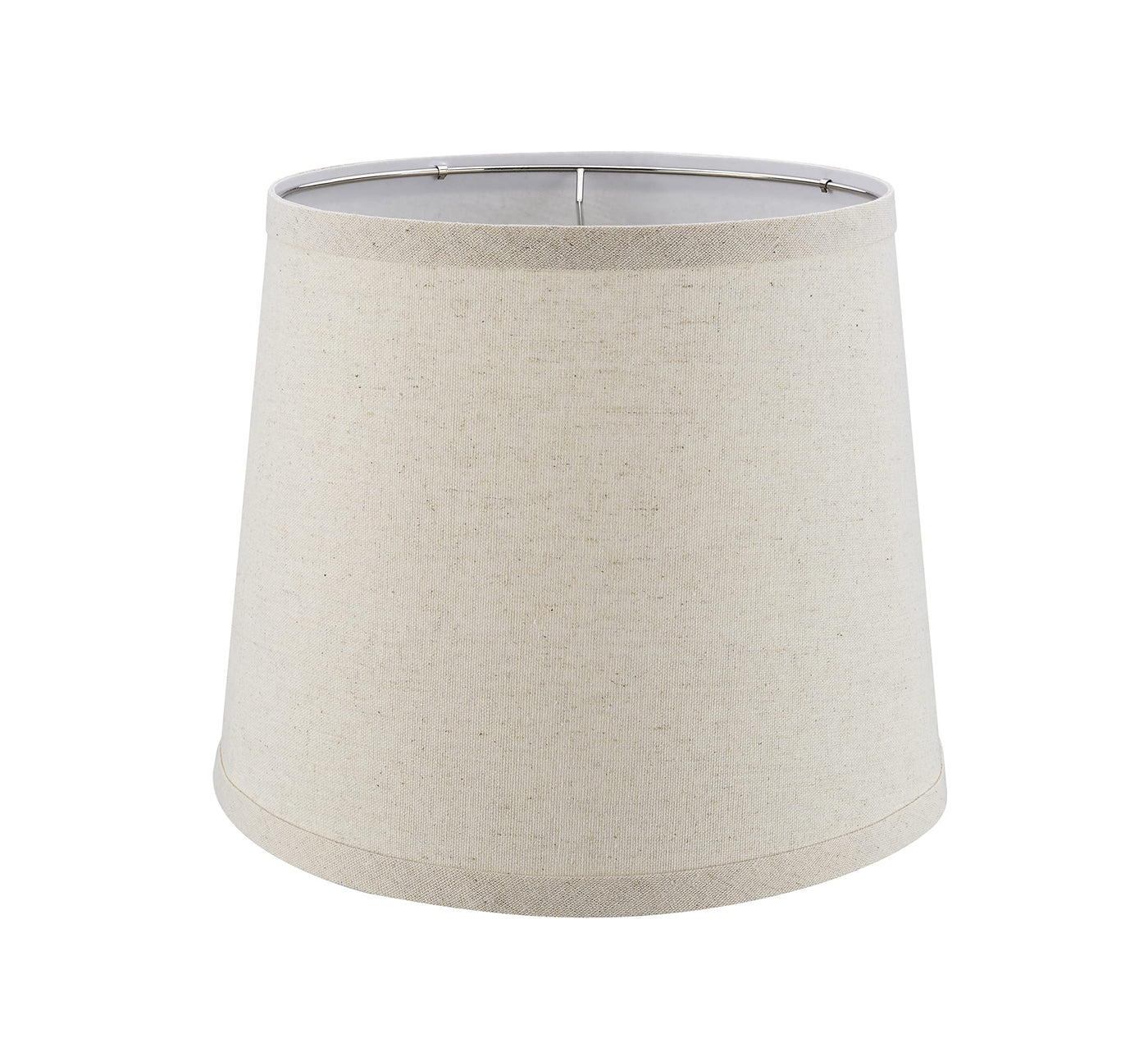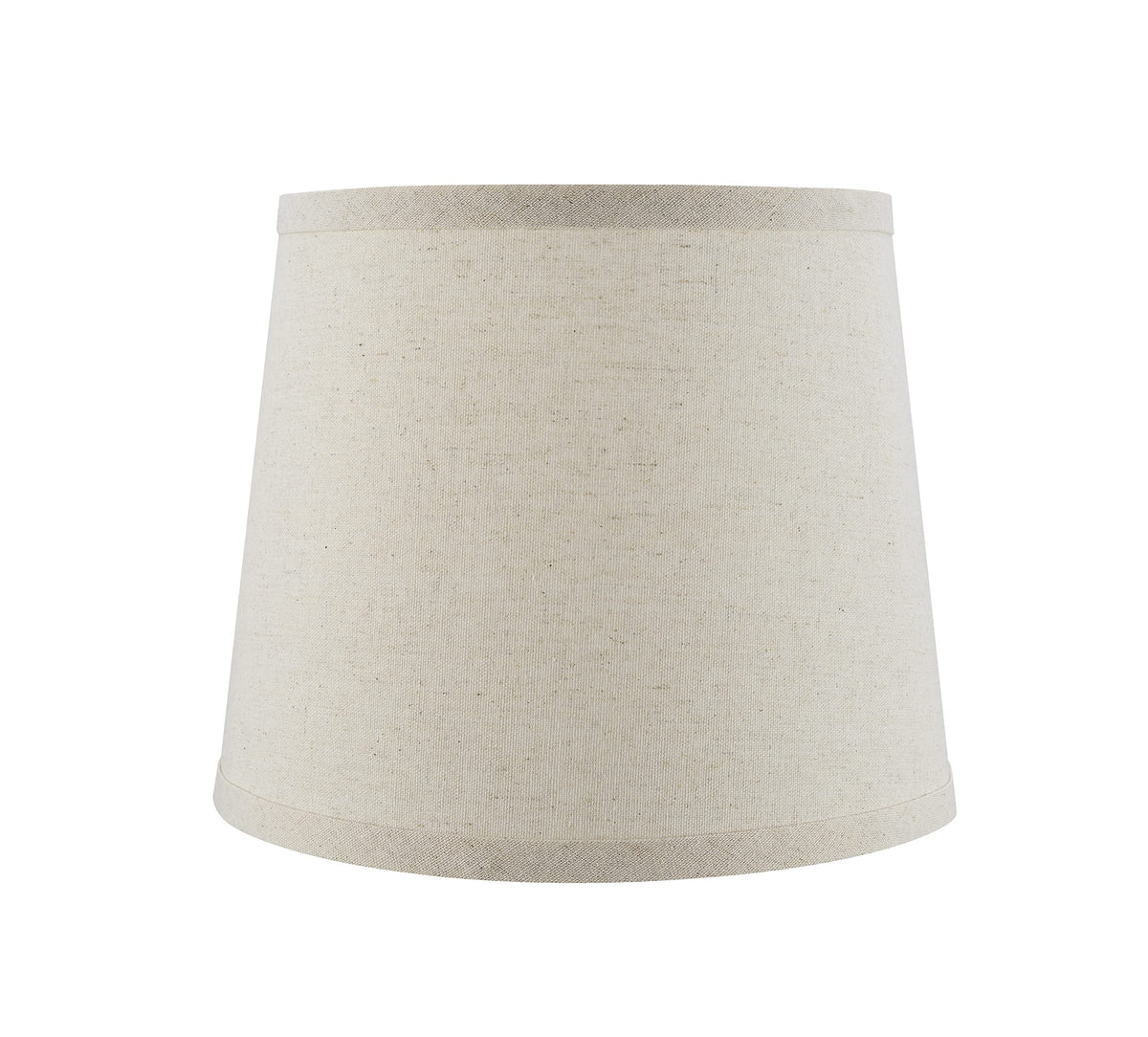 Aspen Creative Item #38006Aspen Creatives KD clips on empire shaped transitional spider shade in oatmeal, made with a linen fabric.The lamp shade size is 9 inch top, 11 inch bottom, and 9 inch slant height.The shade is made with a spider construction, this allows the shade to sit perfectly centered on a lamp harp attachment.Assembly is required for this lampshade but it has easy to set up clips on design. Just fit the top and bottom ring into the clips on each long edge of the shade and fasten the hook and loop once assembled use as desired.Suitable for many table lamps, accent lamps, vintage lamps, candle stick lamps, kids room lamps, bedroom lamps, bedroom table lamps, night stand lamps, reading lamps, bedside reading lamps, living room end table lamps and bedroom night stand lamps.