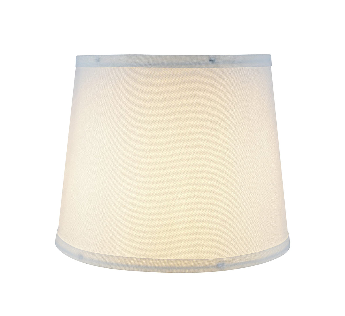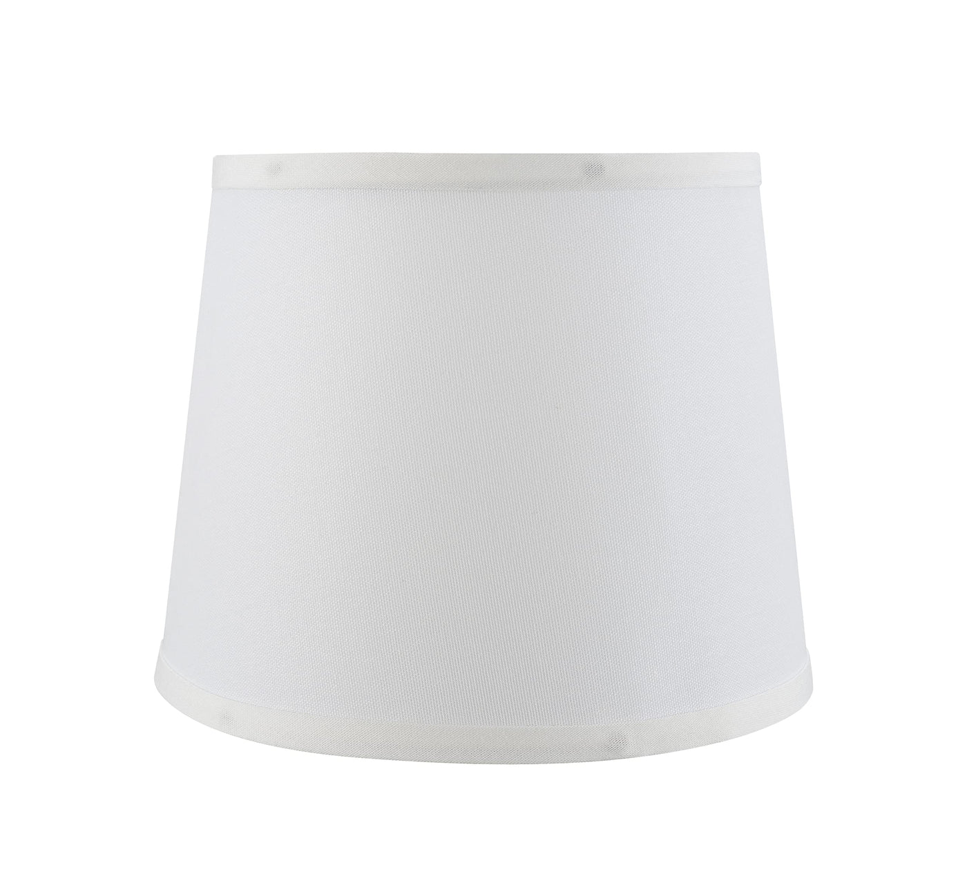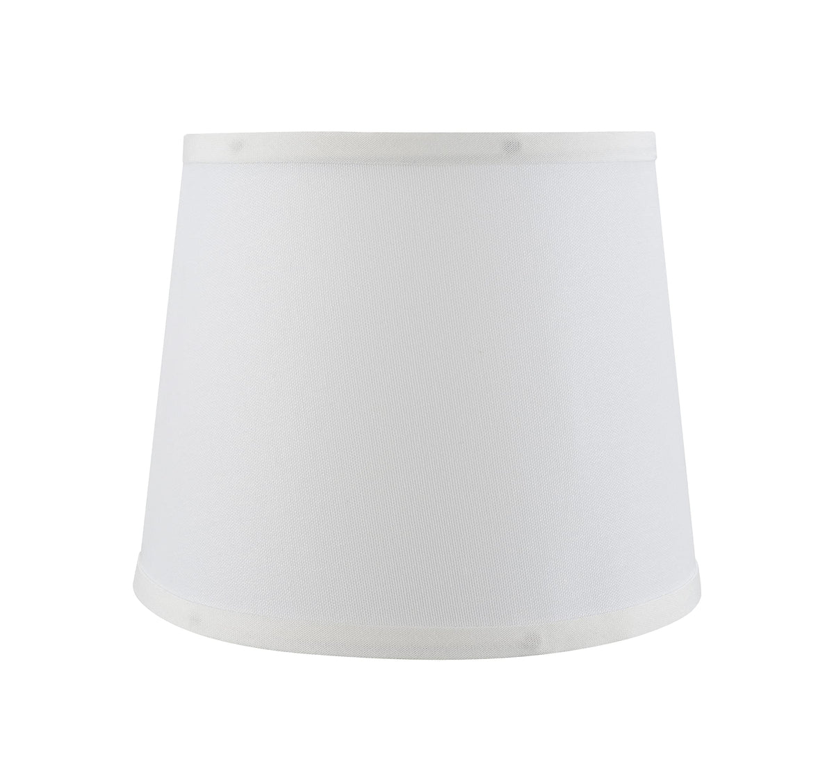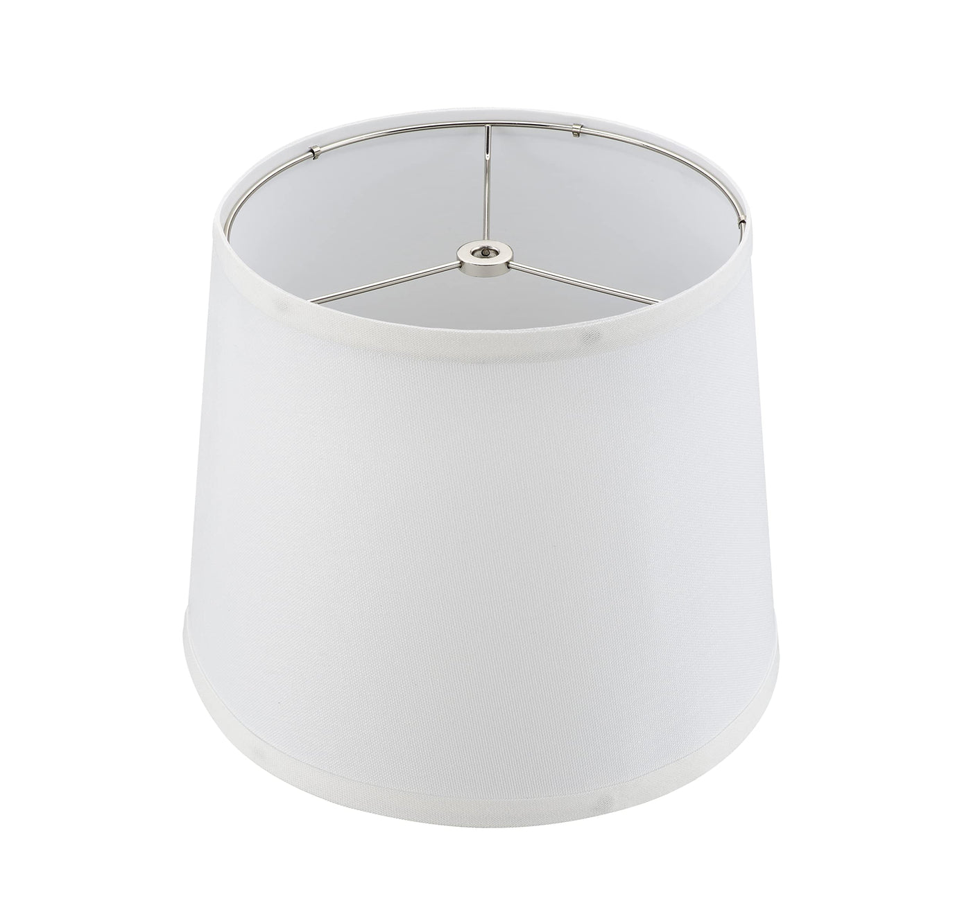 Aspen Creative Item #38007-2Aspen Creatives two pack of KD clips on empire shaped transitional spider shades in white, made with a linen fabric.The lamp shade size is 9 inch top, 11 inch bottom, and 9 inch slant height.The shade is made with a spider construction, this allows the shade to sit perfectly centered on a lamp harp attachment.Assembly is required for this lampshade but it has easy to set up clips on design. Just fit the top and bottom ring into the clips on each long edge of the shade and fasten the hook and loop once assembled use as desired.Suitable for many table lamps, accent lamps, vintage lamps, candle stick lamps, kids room lamps, bedroom lamps, bedroom table lamps, night stand lamps, reading lamps, bedside reading lamps, living room end table lamps and bedroom night stand lamps.