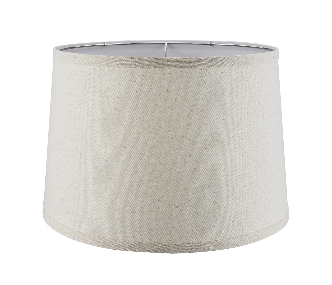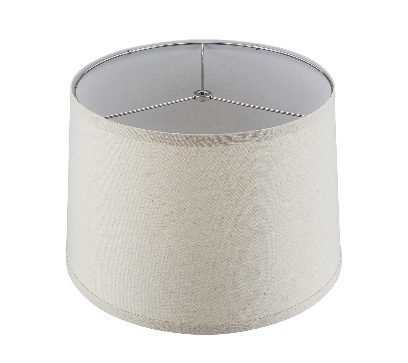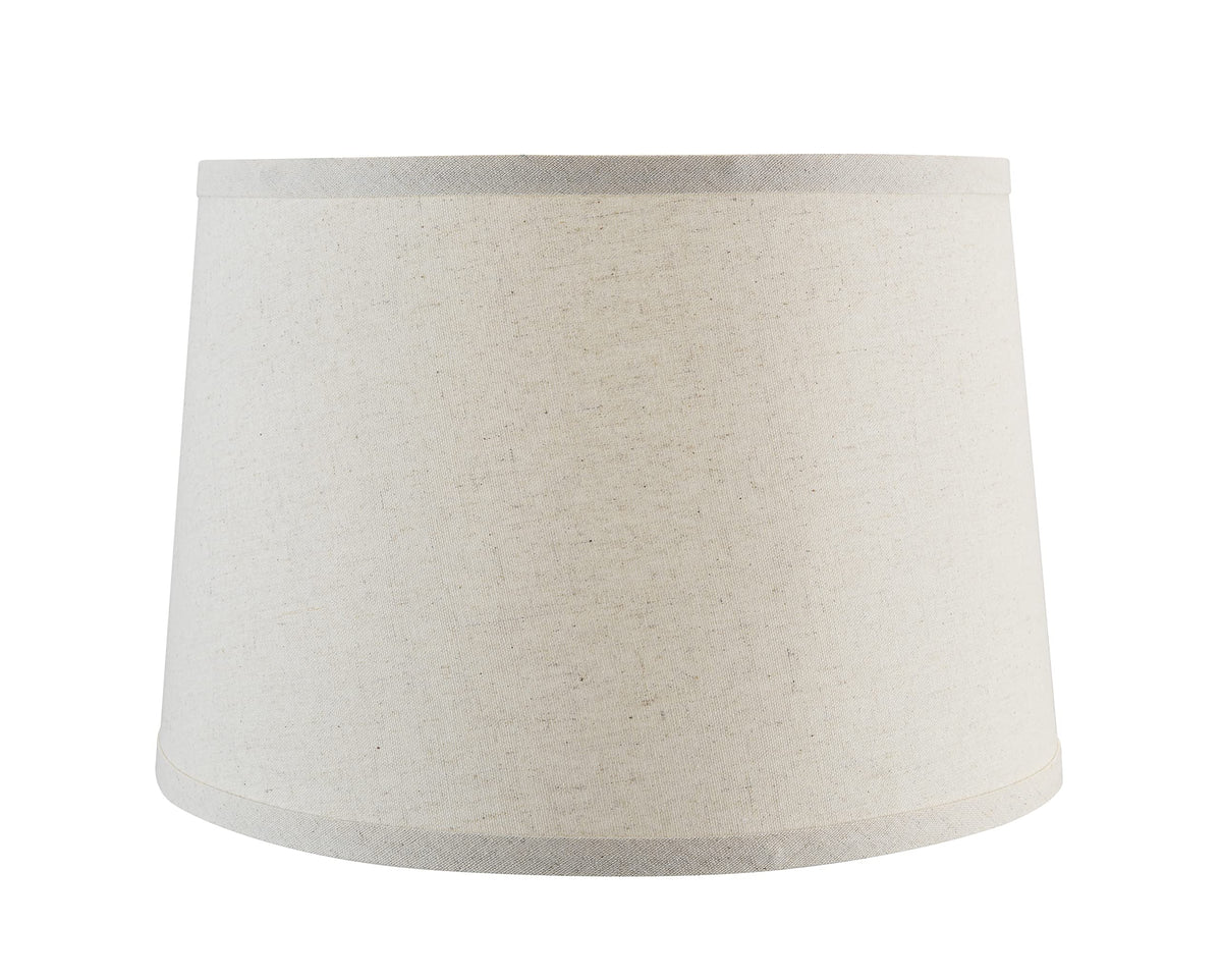 Aspen Creative Item #38026Aspen Creatives KD clips on empire shaped transitional spider shade in oatmeal, made with a linen fabric.The lamp shade size is 13 inch top, 15 inch bottom, and 10 inch slant height.The shade is made with a spider construction, this allows the shade to sit perfectly centered on a lamp harp attachment.Assembly is required for this lampshade but it has easy to set up clips on design. Just fit the top and bottom ring into the clips on each long edge of the shade and fasten the hook and loop once assembled use as desired.Suitable for many table lamps, accent lamps, vintage lamps, candle stick lamps, kids room lamps, bedroom lamps, bedroom table lamps, night stand lamps, reading lamps, bedside reading lamps, living room end table lamps and bedroom night stand lamps.