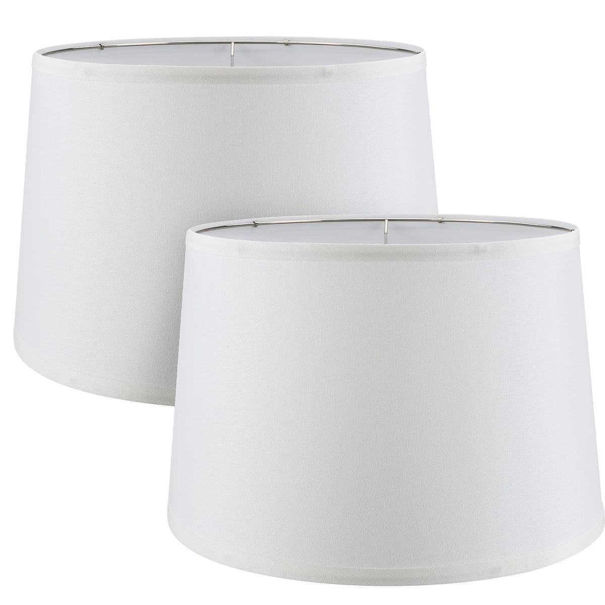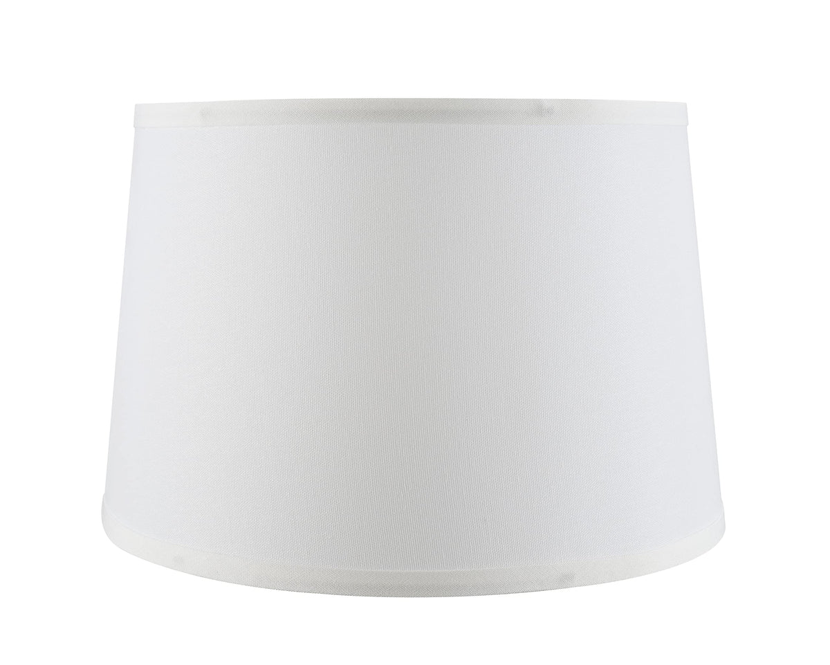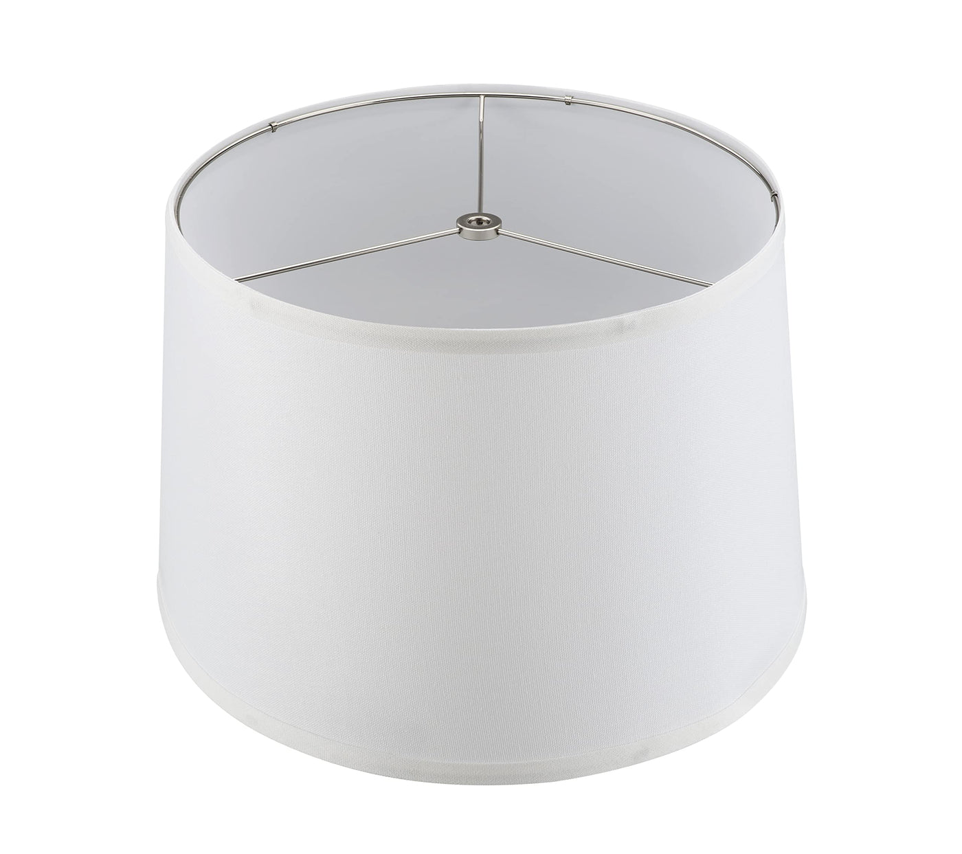 Aspen Creative Item #38027-2Aspen Creatives two pack of KD clips on empire shaped transitional spider shades in white, made with a linen fabric.The lamp shade size is 13 inch top, 15 inch bottom, and 10 inch slant height.The shade is made with a spider construction, this allows the shade to sit perfectly centered on a lamp harp attachment.Assembly is required for this lampshade but it has easy to set up clips on design. Just fit the top and bottom ring into the clips on each long edge of the shade and fasten the hook and loop once assembled use as desired.Suitable for many table lamps, accent lamps, vintage lamps, candle stick lamps, kids room lamps, bedroom lamps, bedroom table lamps, night stand lamps, reading lamps, bedside reading lamps, living room end table lamps and bedroom night stand lamps.