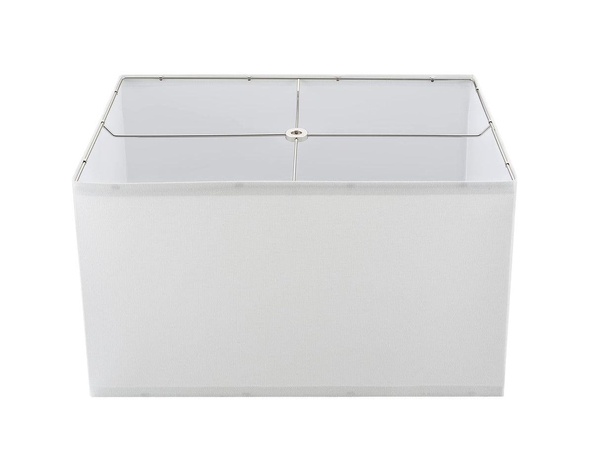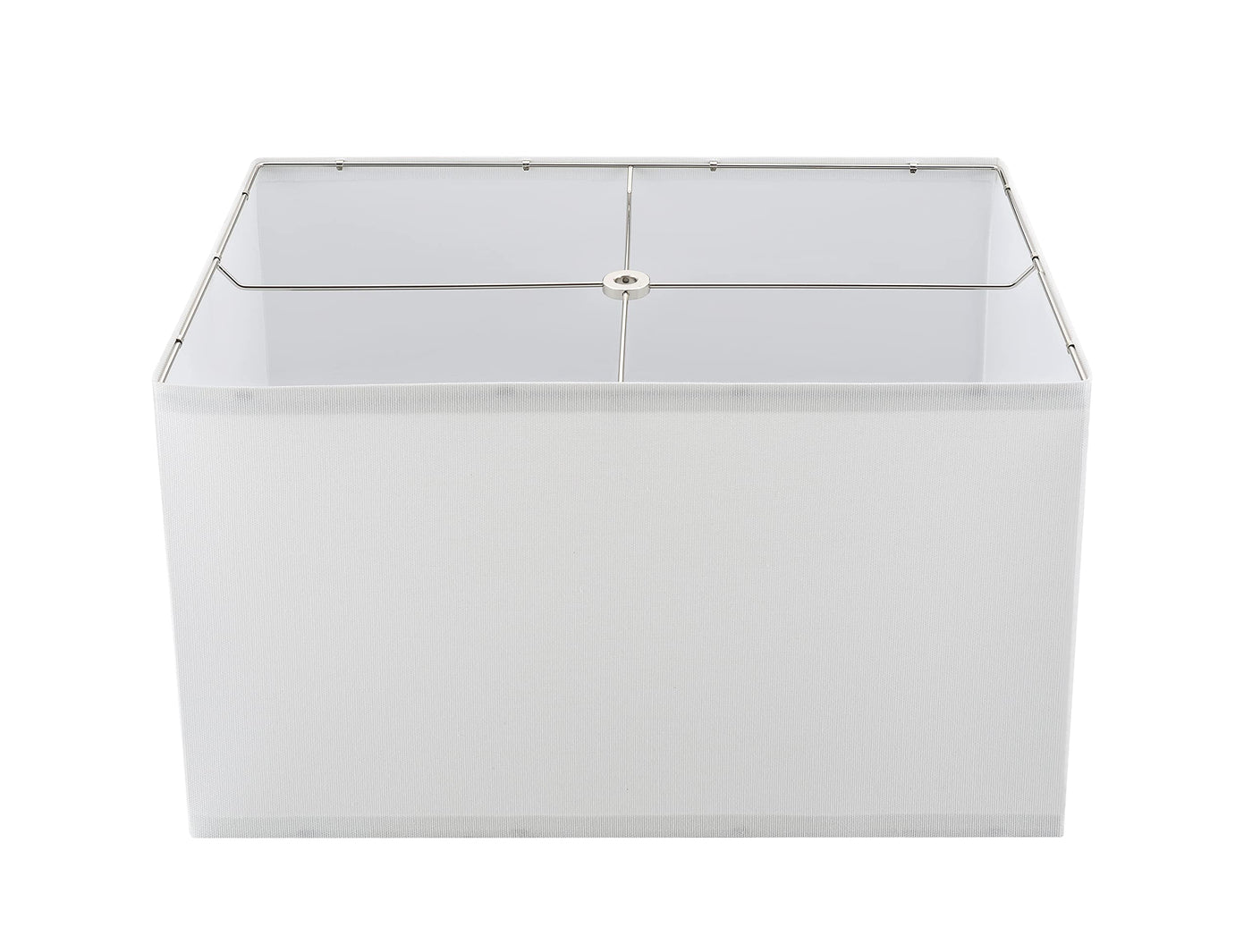Aspen Creative Item #38752-2Aspen Creatives two pack of KD clips on rectangle shaped transitional spider shades in white, made with a linen fabric.The lamp shade size is 11+17 inch top, 11+17 inch bottom, and 10 inch slant height.The shade is made with a spider construction, this allows the shade to sit perfectly centered on a lamp harp attachment.Assembly is required for this lampshade but it has easy to set up clips on design. Just fit the top and bottom ring into the clips on each long edge of the shade and fasten the hook and loop once assembled use as desired.Suitable for many table lamps, accent lamps, vintage lamps, candle stick lamps, kids room lamps, bedroom lamps, bedroom table lamps, night stand lamps, reading lamps, bedside reading lamps, living room end table lamps and bedroom night stand lamps.