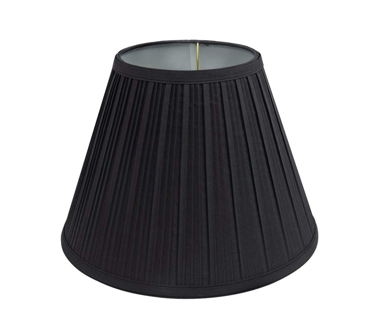 Aspen Creative offers a 1 pack of empire shaped lamp shades with uno fitter. Made with black colored tetoron cotton fabric with pleated. The lamp shade dimensions are 5 inch top, 10 inch bottom, 8 inch slant height. This lamp shade is a UNO construction, designed to fit sockets that measure 33mm wide. UNO fitter ring inner diameter is 33mm. Suitable for table lamps, accent lamps, vintage lamps, candle stick lamps, kid's room lamps, bedroom lamps, bedroom table lamps, night stand lamps, reading lamps, bedside reading lamps, living room end table lamps and bedroom night stand lamps.