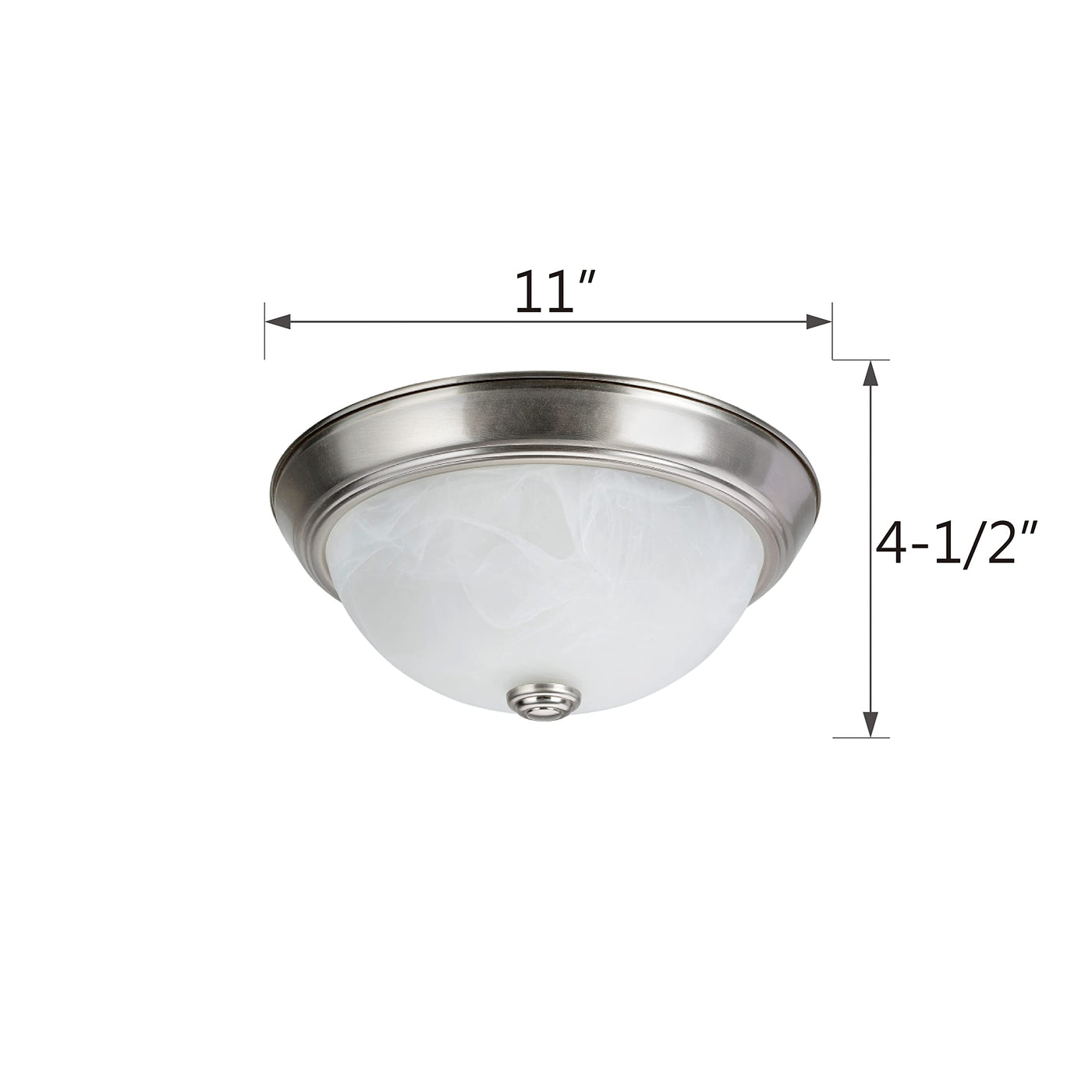 Constructed with well-made metal and featuring a brushed nickel finish, this flush mount light is complemented by a white alabaster glass shade. With total dimensions of 11 inches in diameter and a height of 4.5 inches, it fits seamlessly into various settings, including living rooms, bedrooms, hallways, and family rooms. The shade measures 8-5/8 inches in diameter and 3 inches in height, allowing for a beautiful diffusion of light.