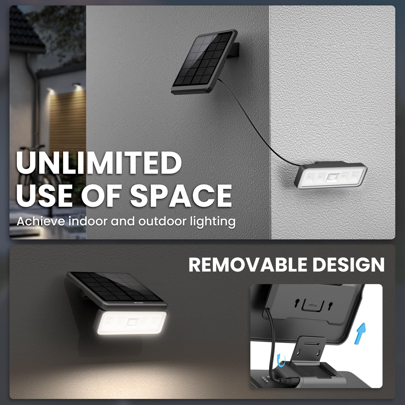 Q: Can the solar panel be installed separately from the floodlight?A: Yes, the AUDERWIN floodlight features a removable design that allows the solar panel to be installed separately. This split design ensures that the solar panel can be positioned for optimal sunlight exposure while the light itself can be placed wherever needed.